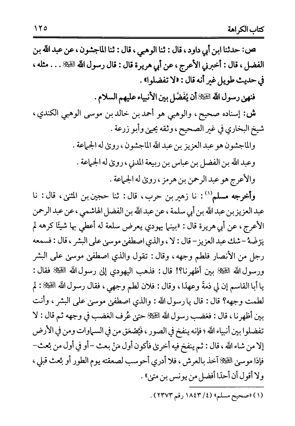 وأخرجه مسلم (¬1): نا زهير بن حرب، قال: ثنا حجين بن المثني، قال: نا عبد العزيز بن عبد الله بن أبي سلمة، عن عبد الله بن الفضل الهاشمي، عن عبد الرحمن الأعرج، عن أبي هريرة قال: "بينما يهودي يعرض سلعة له أعطي بها شيئًا كرهه لم يَرْضَهُ -شك عبد العزيز- قال: لا، والذي اصطفى موسى على البشر، قال: فسمعه رجل من الأنصار فلطم وجهه، وقال: تقول والذي اصطفى موسى على البشر ورسول الله -عليه السلام- بين أظهرنا؟! قال: فذهب اليهودي إلى رسول الله -عليه السلام- فقال: يا أبا القاسم إن لي ذمةً وعهدًا، وقال: فلان لطم وجهي، فقال رسول الله -عليه السلام-: لم لطمت وجهه؟ قال: قال يا رسول الله: والذي اصطفى موسى على البشر، وأنت بين أظهرنا، قال: فغضب رسول الله -عليه السلام- حتى عُرف الغضب في وجهه ثم قال: لا تفضلوا بين أنبياء الله؛ فإنه ينفخ في الصور، فَيُصْعَق من في السماوات ومن في الأرض إلا من شاء الله، قال: ثم ينفخ فيه أخرى فأكون أول مَنْ بعث -أو في أول من بُعث- فإذا موسى -عليه السلام- آخذ بالعرش، فلا أدري أحوسب لصعقته يوم الطور أو بُعث قبلي، ولا أقول أن أحدًا أفضل من يونس بن متى".