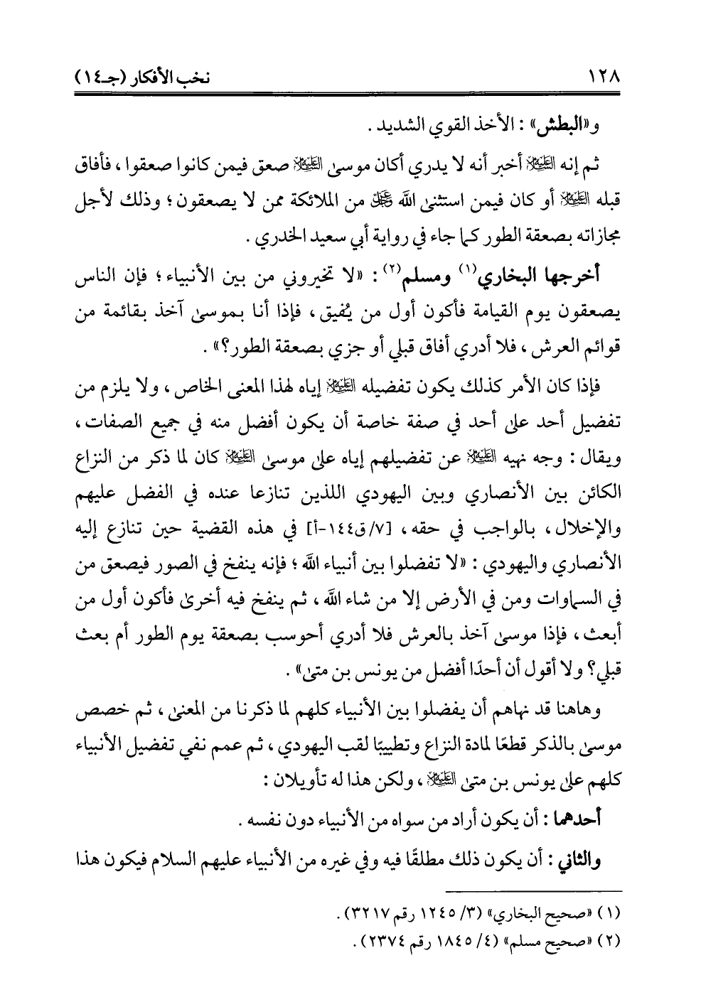 وهاهنا قد نهاهم أن يفضلوا بين الأنبياء كلهم لما ذكرنا من المعني، ثم خصص موسى بالذكر قطعًا لمادة النزاع وتطييبًا لقب اليهودي، ثم عمم نفي تفضيل الأنبياء كلهم علي يونس بن متى -عليه السلام-، ولكن هذا له تأويلان: