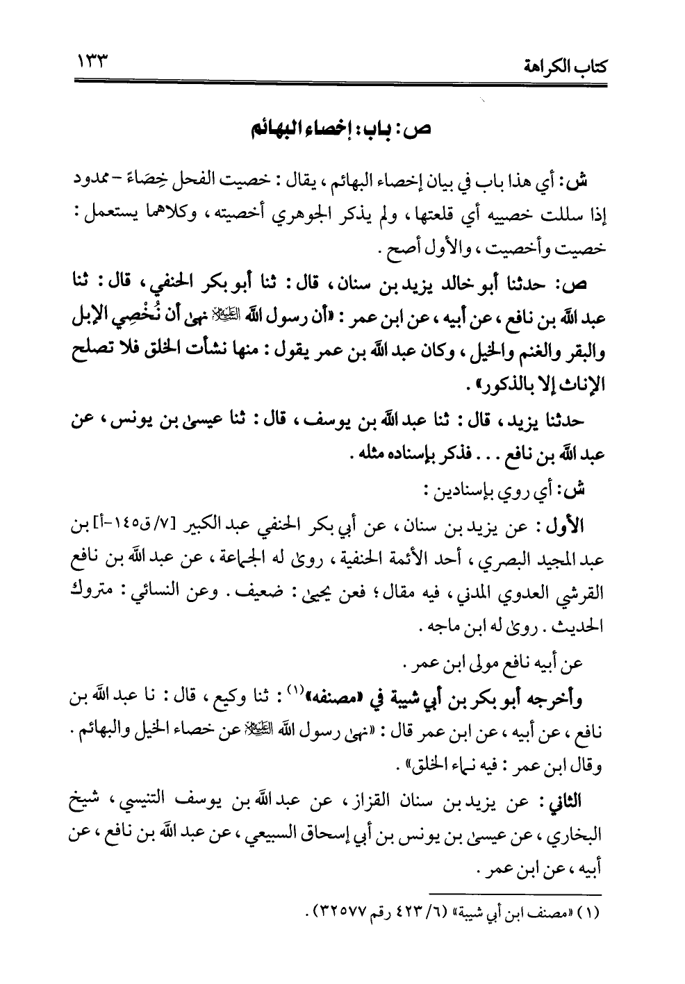 ص: حدثنا أبو خالد يزيد بن سنان، قال: ثنا أبو بكر الحنفي، قال: ثنا عبد الله بن نافع، عن أبيه، عن ابن عمر: "أن رسول الله -عليه السلام- نهى أن نُخْصِي الإبل والبقر والغنم والخيل، وكان عبد الله بن عمر يقول: منها نشأت الخلق فلا تصلح الإناث إلا بالذكور".