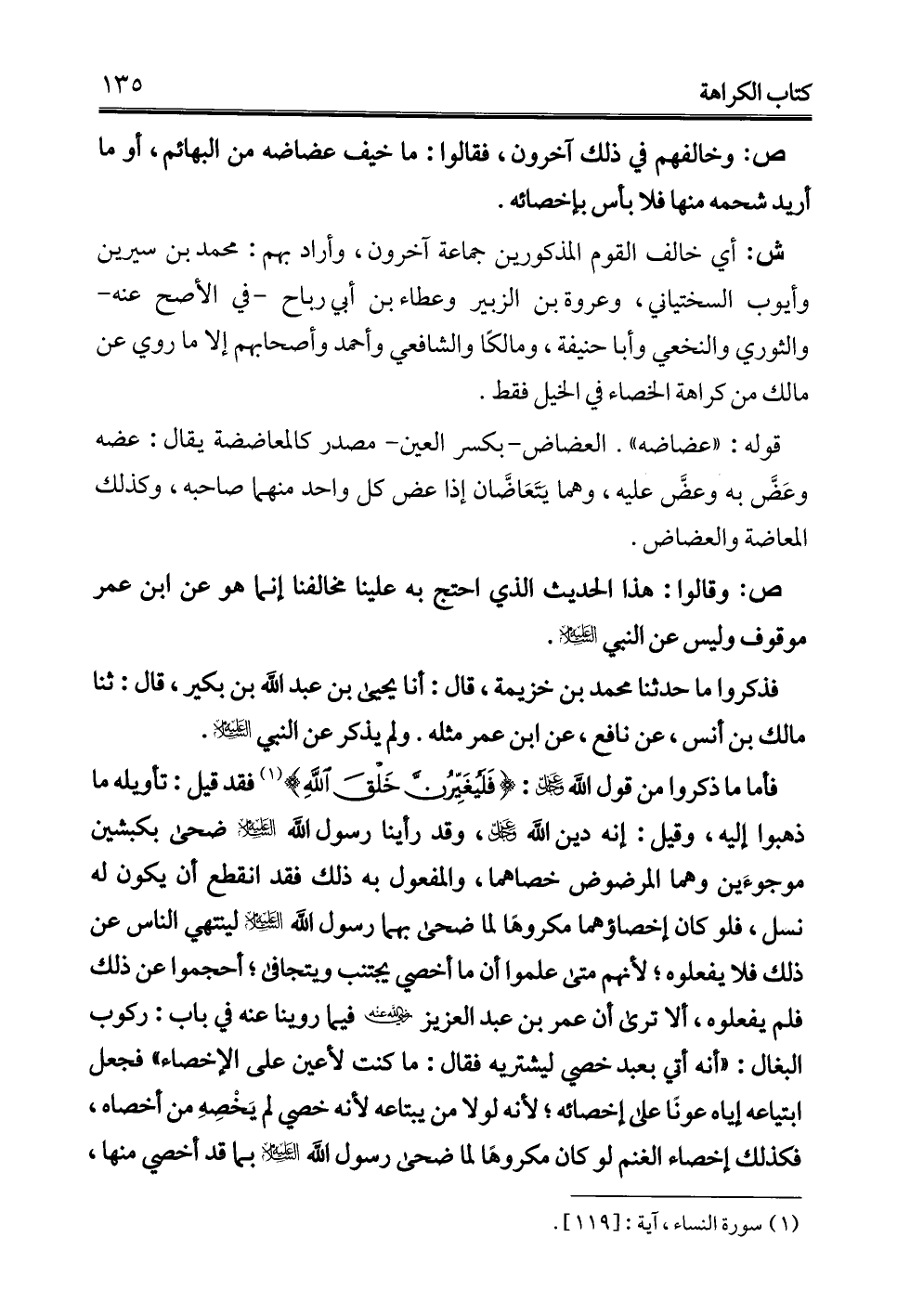 فأما ما ذكروا من قول الله -عز وجل-: {فَلَيُغَيِّرُنَّ خَلْقَ اللَّهِ} (¬1) فقد قيل: تأويله ما ذهبوا إليه، وقيل: إنه دين الله -عز وجل-، وقد رأينا رسول الله -عليه السلام- ضحى بكبشين موجوءَين وهما المرضوض خصاهما، والمفعول به ذلك فقد انقطع أن يكون له نسل، فلو كان إخصاؤهما مكروهًا لما ضحى بهما رسول الله -عليه السلام- لينتهي الناس عن ذلك فلا يفعلوه؛ لأنهم متى علموا أن ما أخصي يجتنب ويتجافى؛ أحجموا عن ذلك فلم يفعلوه، ألا ترى أن عمر بن عبد العزيز - رضي الله عنه - فيما روينا عنه في باب: ركوب البغال: "أنه أتي بعبد خصي ليشتريه فقال: ما كنت لأعين على الإخصاء" فجعل ابتياعه إياه عونًا علي إخصائه؛ لأنه لولا من يبتاعه لأنه خصي لم يَخْصِهِ من أخصاه، فكذلك إخصاء الغنم لو كان مكروهًا لما ضحى رسول الله -عليه السلام- بما قد أخصي منها،