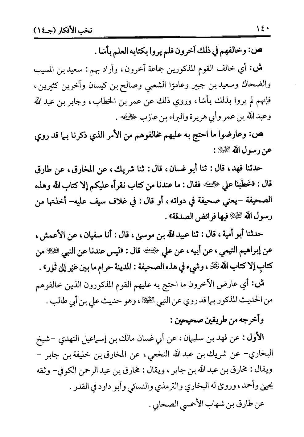 حدثنا فهد، قال: ثنا أبو غسان، قال: ثنا شريك، عن المخارق، عن طارق قال: "خَطَبَنَا علي - رضي الله عنه - فقال: ما عندنا من كتاب نقرأه عليكم إلا كتاب الله وهذه الصحيفة -يعني صحيفة في دواته، أو قال: في غلاف سيف عليه- أخذتها من رسول الله -عليه السلام- فيها فرائض الصدقة".