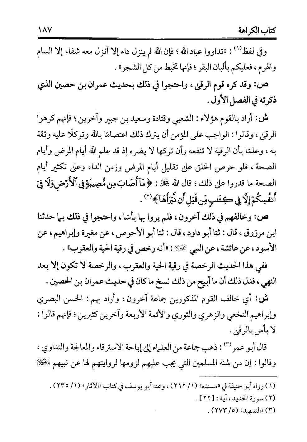 ش: أراد بالقوم هؤلاء: الشعبي وقتادة وسعيد بن جبير وآخرين؛ فإنهم كرهوا الرقي، وقالوا: الواجب على المؤمن أن يترك ذلك اعتصامًا بالله وتوكلًا عليه وثقة به، وعلمًا بأن الرقية لا تنفعه وأن تركها لا يضره إذ قد علم الله أيام المرض وأيام الصحة، فلو حرص الخلق على تقليل أيام المرض وزمن الداء وعلي تكثير أيام الصحة ما قدروا على ذلك؛ قال الله -عز وجل-: {مَا أَصَابَ مِنْ مُصِيبَةٍ فِي الْأَرْضِ وَلَا فِي أَنْفُسِكُمْ إِلَّا فِي كِتَابٍ مِنْ قَبْلِ أَنْ نَبْرَأَهَا} (¬2).