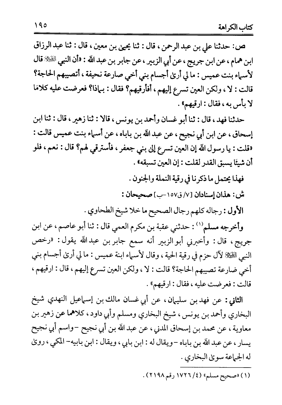 ص: حدثنا علي بن عبد الرحمن، قال: ثنا يحيى بن معين، قال: ثنا عبد الرزاق ابن همام، عن ابن جريج، عن أبي الزبير، عن جابر بن عبد الله: "أن النبي -عليه السلام- قال لأسماء بنت عميس: ما لي أرى أجسام بني أخي صارعة نحيفة، أتصيبهم الحاجة؟ قالت: لا, ولكن العين تسرع إليهم، أفأرقيهم؟ فقال: بماذا؟ فعرضت عليه كلامًا لا بأس به، فقال: ارقيهم".