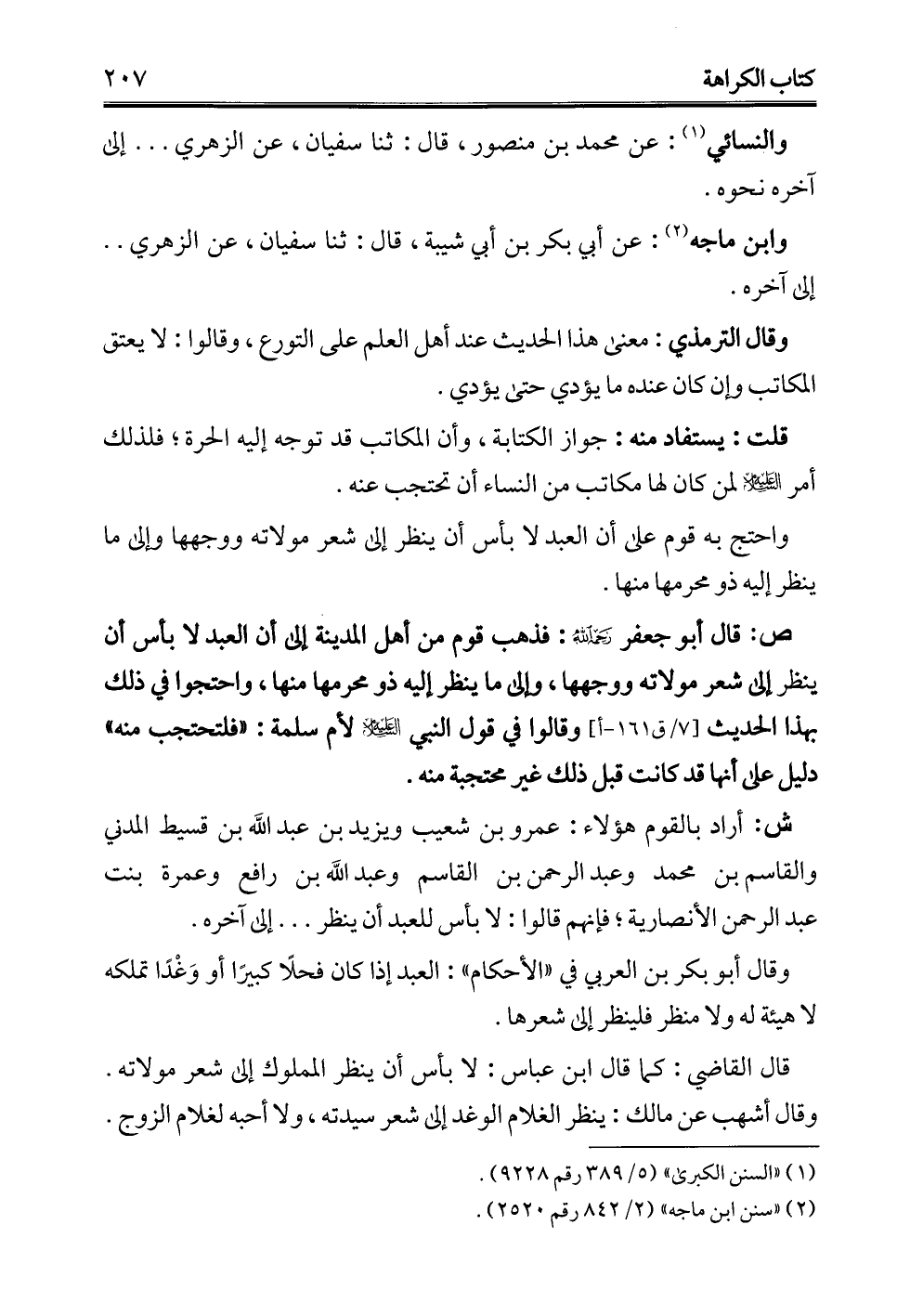 ش: أراد بالقوم هؤلاء: عمرو بن شعيب ويزيد بن عبد الله بن قسيط المدني والقاسم بن محمَّد وعبد الرحمن بن القاسم وعبد الله بن رافع وعمرة بنت عبد الرحمن الأنصارية؛ فإنهم قالوا: لا بأس للعبد أن ينظر. . . . إلى آخره.