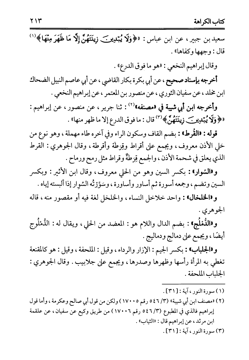 وأخرجه ابن أبي شيبة في "مصنفه" (¬2): ثنا جرير، عن منصور، عن إبراهيم: " {وَلَا يُبْدِينَ زِينَتَهُنَّ} (¬3) قال: ما فوق الدرع إلا ما ظهر منها".