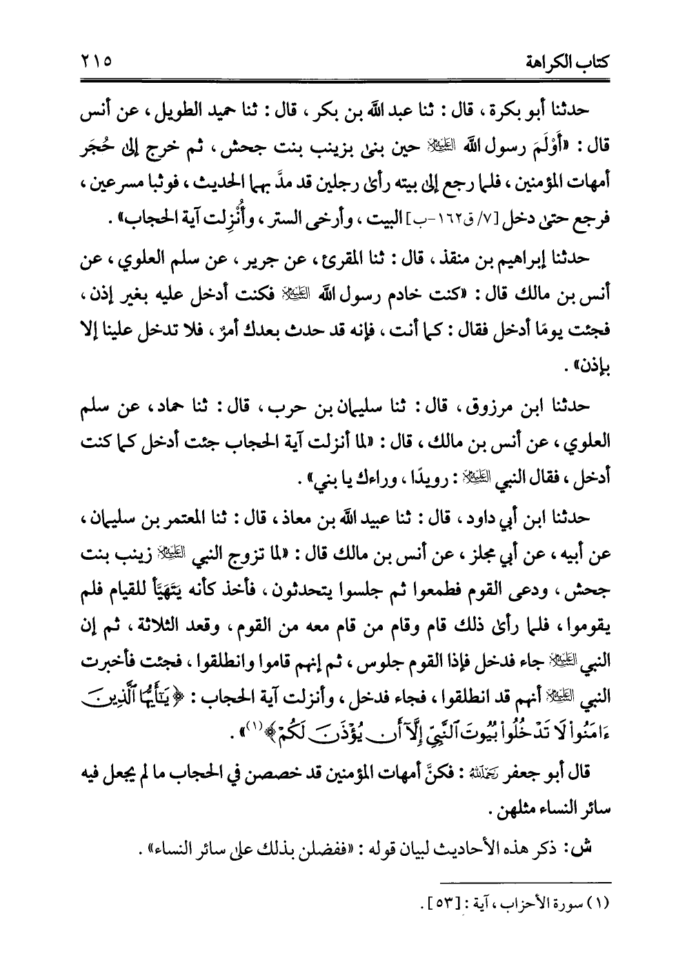 حدثنا ابن أبي داود، قال: ثنا عبيد الله بن معاذ، قال: ثنا المعتمر بن سليمان، عن أبيه، عن أبي مجلز، عن أنس بن مالك قال: "لما تزوج النبي -عليه السلام- زينب بنت جحش، ودعى القوم فطمعوا ثم جلسوا يتحدثون، فأخذ كأنه يتهَيَّأ للقيام فلم يقوموا، فلما رأى ذلك قام وقام من قام معه من القوم، وقعد الثلاثة، ثم إن النبي -عليه السلام- جاء فدخل فإذا القوم جلوس، ثم إنهم قاموا وانطلقوا، فجئت فأخبرت النبي -عليه السلام- أنهم قد انطلقوا، فجاء فدخل، وأنزلت آية الحجاب: {يَا أَيُّهَا الَّذِينَ آمَنُوا لَا تَدْخُلُوا بُيُوتَ النَّبِيِّ إِلَّا أَنْ يُؤْذَنَ لَكُمْ} (¬1) ".