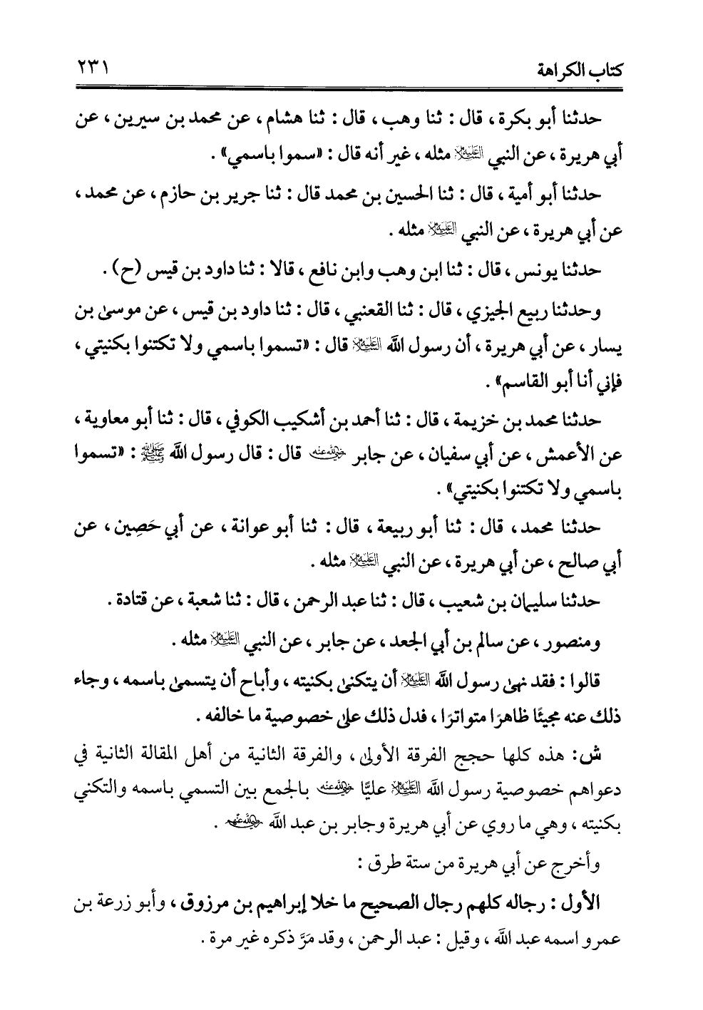 ش: هذه كلها حجج الفرقة الأولى، والفرقة الثانية من أهل المقالة الثانية في دعواهم خصوصية رسول الله -عليه السلام- عليًّا - رضي الله عنه - بالجمع بين التسمي باسمه والتكني بكنيته، وهي ما روي عن أبي هريرة وجابر بن عبد الله - رضي الله عنهم -.