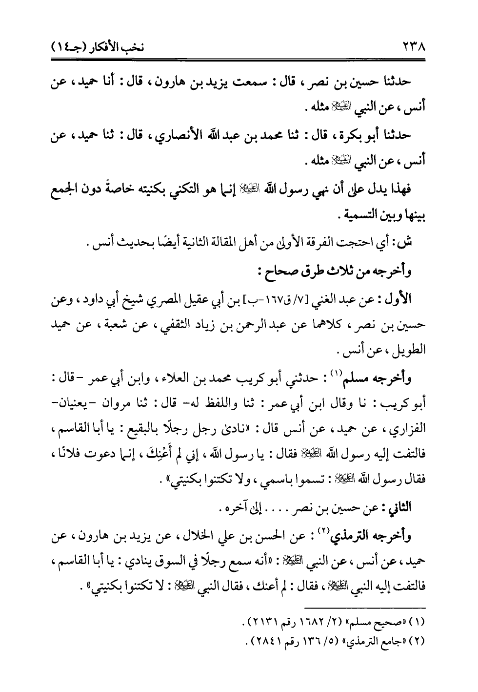 ش: أي احتجت الفرقة الأولى من أهل المقالة الثانية أيضًا بحديث أنس.