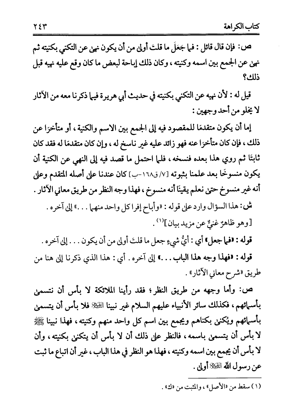 ص: فإن قال قائل: فما جَعَلَ ما قلتَ أولى من أن يكون نهى عن التكني بكنيته ثم نهى عن الجمع بين اسمه وكنيته، وكان ذلك إباحة لبعض ما كان وقع عليه نهيه قبل ذلك؟