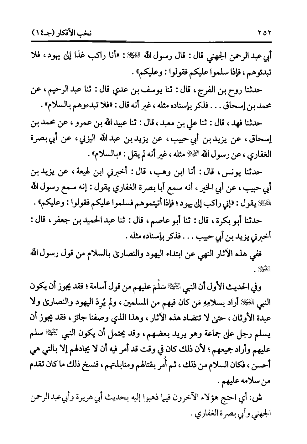 أبي عبد الرحمن الجهني قال: قال رسول الله -عليه السلام-: "أنا راكب غدًا إلى يهود، فلا تبدئوهم، فإذا سلموا عليكم فقولوا: وعليكم".