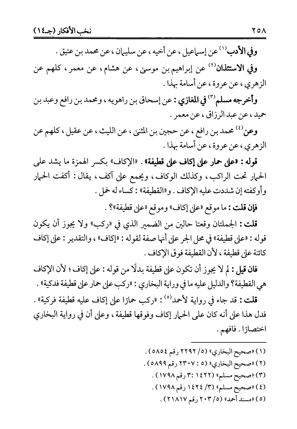 قلت: قد جاء في رواية لأحمد (¬5): "ركب حمارًا على إكاف عليه قطيفة فركية". فدل هذا على أنه كان على الحمار إكاف وفوقها قطيفة، وعلى أن في رواية البخاري اختصارًا. فافهم.
