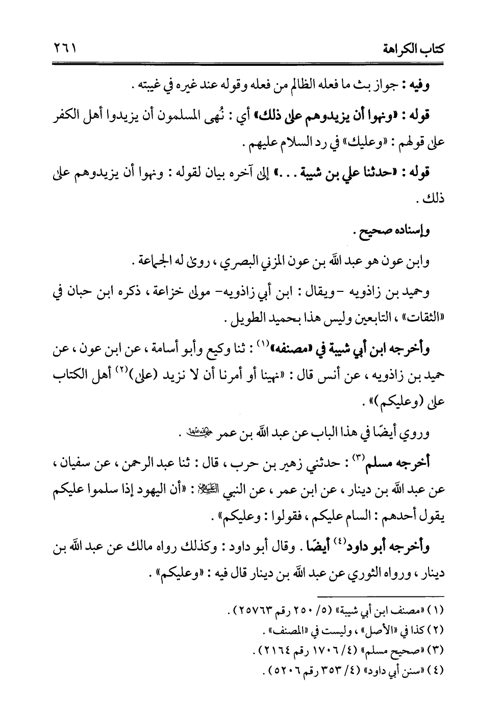قوله: "ونهوا أن يزيدوهم على ذلك" أي: نُهى المسلمون أن يزيدوا أهل الكفر على قولهم: "وعليك" في رد السلام عليهم.