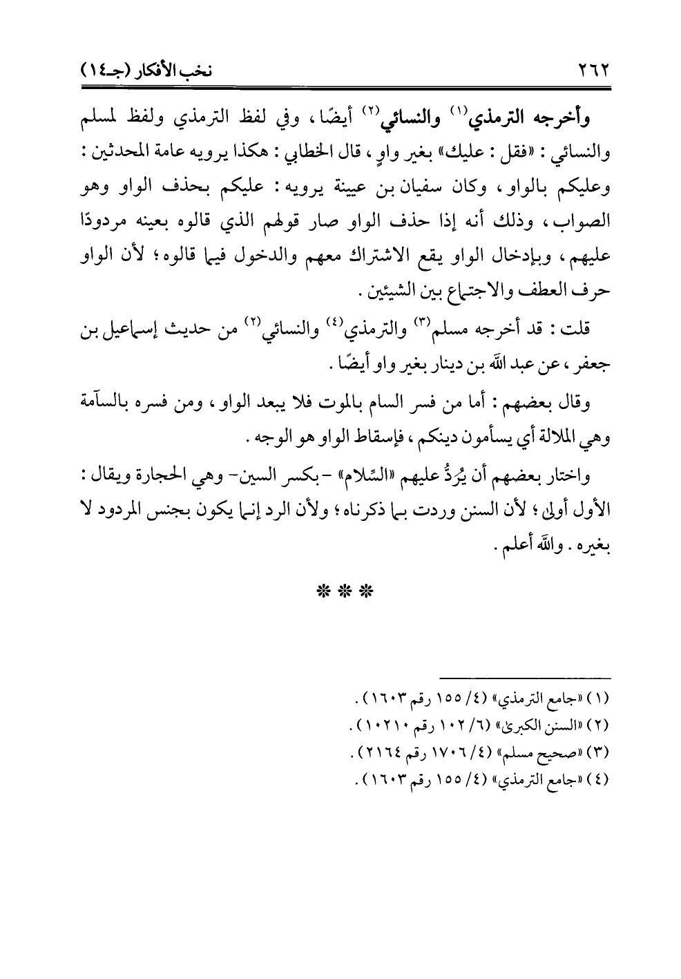 وأخرجه الترمذي (¬1) والنسائي (¬2) أيضًا، وفي لفظ الترمذي ولفظ لمسلم والنسائي: "فقل: عليك" بغير واوٍ، قال الخطابي: هكذا يرويه عامة المحدثين: وعليكم بالواو، وكان سفيان بن عيينة يرويه: عليكم بحذف الواو وهو الصواب، وذلك أنه إذا حذف الواو صار قولهم الذي قالوه بعينه مردودًا عليهم، وبإدخال الواو يقع الاشتراك معهم والدخول فيما قالوه؛ لأن الواو حرف العطف والاجتماع بين الشيئين.