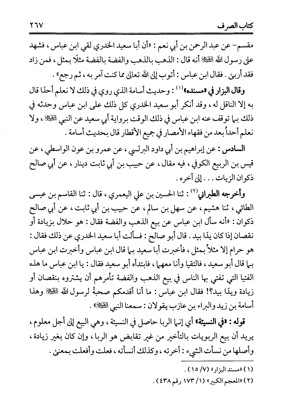 وأخرجه الطبراني (¬2): ثنا الحسين بن علي اليعمري، قال: ثنا القاسم بن عيسى الطائي، ثنا هشيم، عن سهل بن سالم، عن حبيب بن أبي ثابت، عن أبي صالح ذكوان: "أنه سأل ابن عباس عن بيع الذهب والفضة فقال: هو حلال بزيادة أو نقصان إذا كان يدًا بيد. قال أبو صالح: فسألت أبا سعيد الخدري عن ذلك فقال: هو حرام إلا مثلا بمثل، فأخبرت أبا سعيد بما قال ابن عباس وأخبرت ابن عباس بما قال أبو سعيد، فالتقيا وأنا معهما، فابتدأه أبو سعيد فقال: يا ابن عباس ما هذه الفتيا التي تفتي بها الناس في بيع الذهب والفضة تأمرهم أن يشتروه بنقصان أو زيادة ويدًا بيد؟! فقال ابن عباس: ما أنا أقدمكم صحبةً لرسول الله -عليه السلام- وهذا أسامة بن زيد والبراء بن عازب يقولان: سمعنا النبي -عليه السلام-".