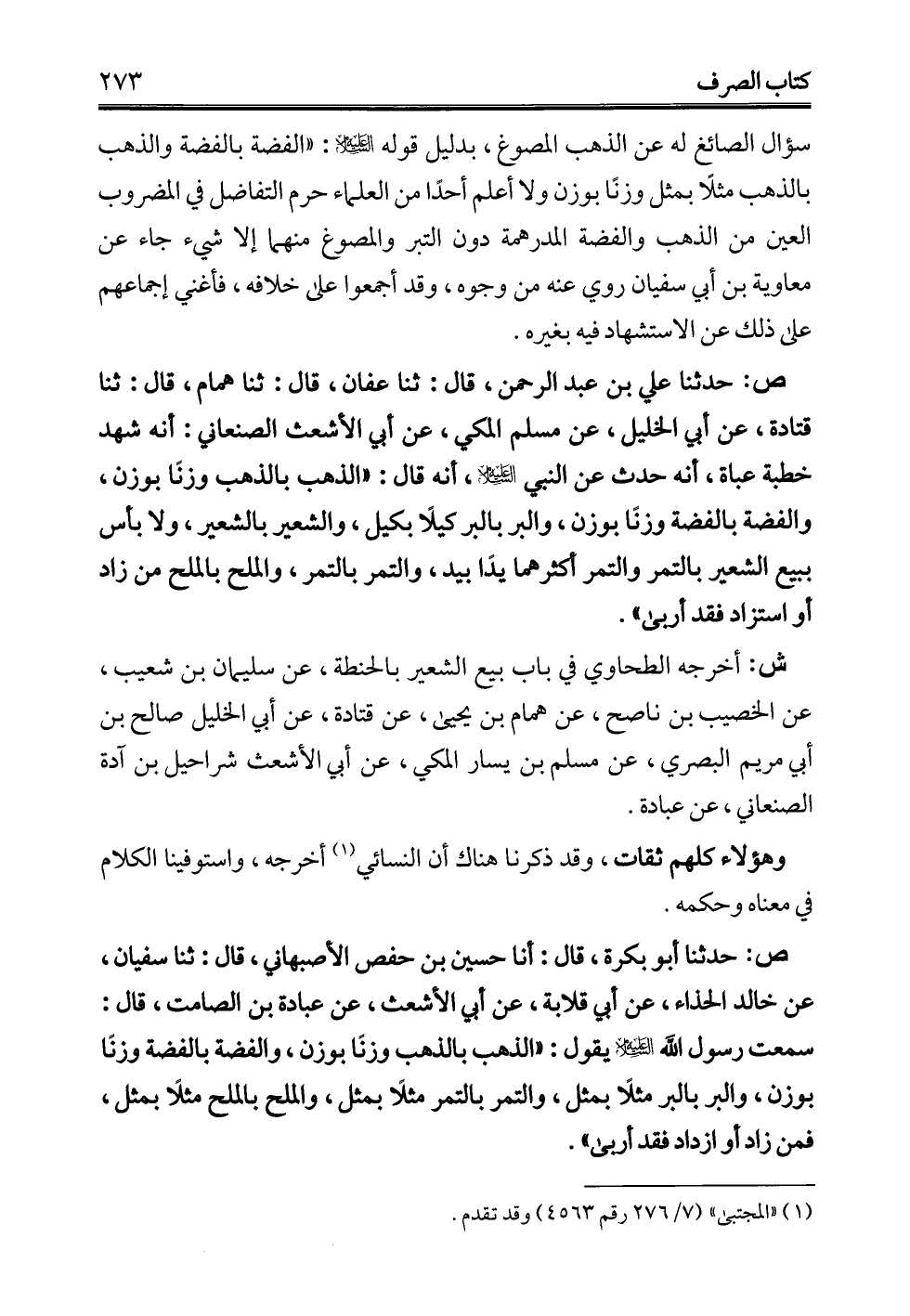 ش: أخرجه الطحاوي في باب بيع الشعير بالحنطة، عن سليمان بن شعيب، عن الخصيب بن ناصح، عن همام بن يحيى، عن قتادة، عن أبي الخليل صالح بن أبي مريم البصري، عن مسلم بن يسار المكي، عن أبي الأشعث شراحيل بن آدة الصنعاني، عن عبادة.