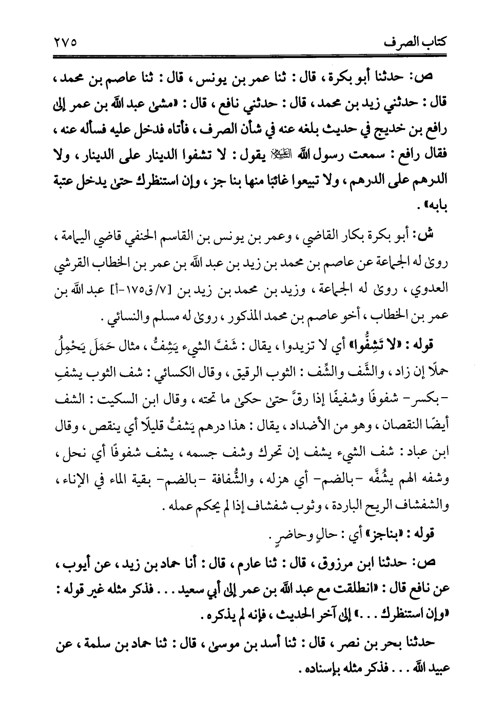 ص: حدثنا أبو بكرة، قال: ثنا عمر بن يونس، قال: ثنا عاصم بن محمَّد، قال: حدثني زيد بن محمَّد، قال: حدثني نافع، قال: "مشى عبد الله بن عمر إلى رافع بن خديج في حديث بلغه عنه في شأن الصرف، فأتاه فدخل عليه فسأله عنه، فقال رافع: سمعت رسول الله -عليه السلام- يقول: لا تشفوا الدينار على الدينار، ولا الدرهم على الدرهم، ولا تبيعوا غائبًا منها بناجز، وإن استنظرك حتى يدخل عتبة بابه".