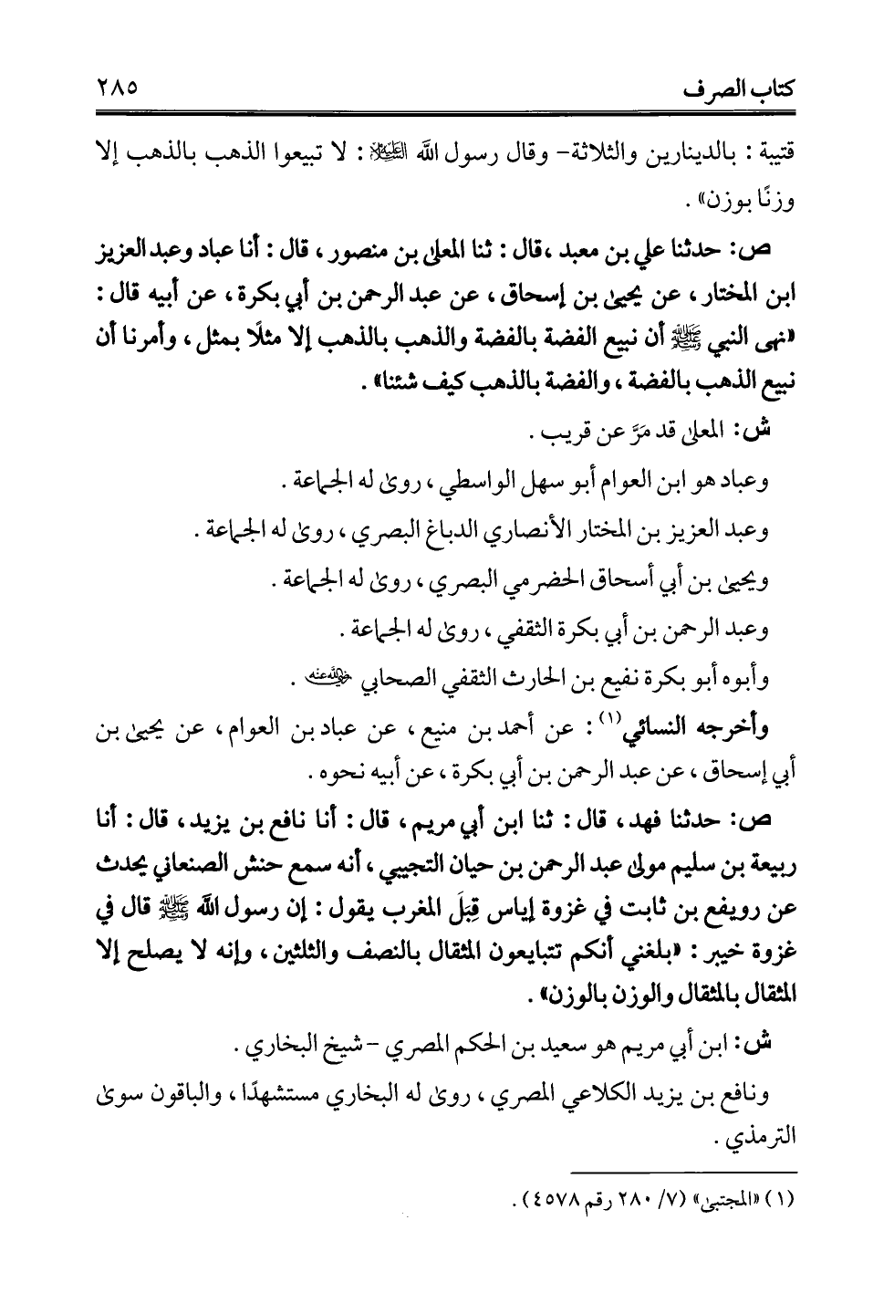 ص: حدثنا علي بن معبد، قال: ثنا المعلى بن منصور، قال: أنا عباد وعبد العزيز ابن المختار، عن يحيى بن إسحاق، عن عبد الرحمن بن أبي بكرة، عن أبيه قال: "نهى النبي - صلى الله عليه وسلم - أن نبيع الفضة بالفضة والذهب بالذهب إلا مثلًا بمثل، وأمرنا أن نبيع الذهب بالفضة، والفضة بالذهب كيف شئنا".