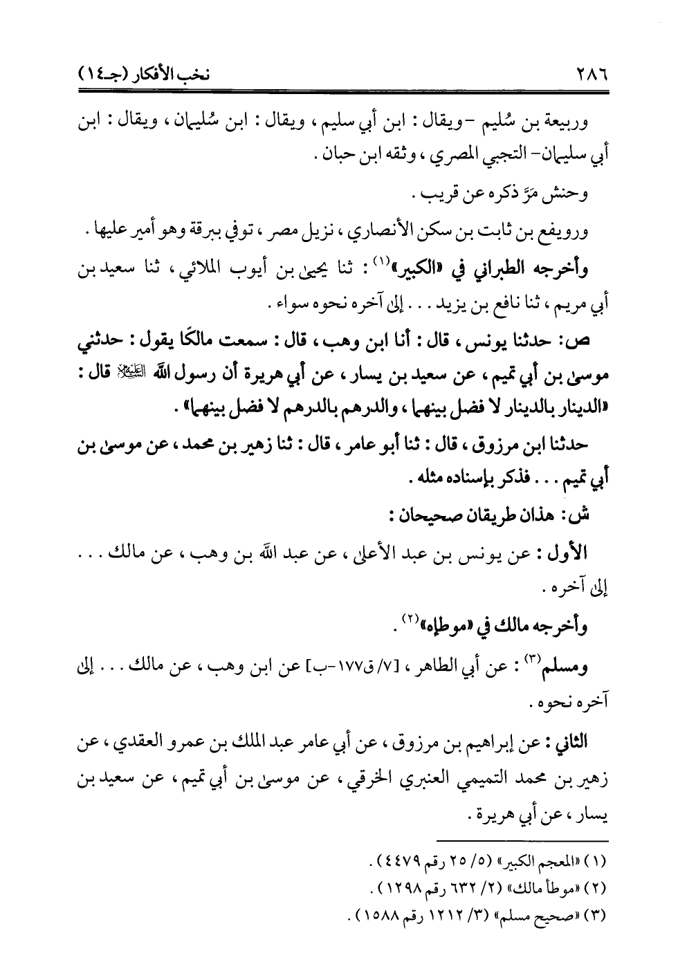 ص: حدثنا يونس، قال: أنا ابن وهب، قال: سمعت مالكًا يقول: حدثني موسى بن أبي تميم، عن سعيد بن يسار، عن أبي هريرة أن رسول الله -عليه السلام- قال: "الدينار بالدينار لا فضل بينهما، والدرهم بالدرهم لا فضل بينهما".