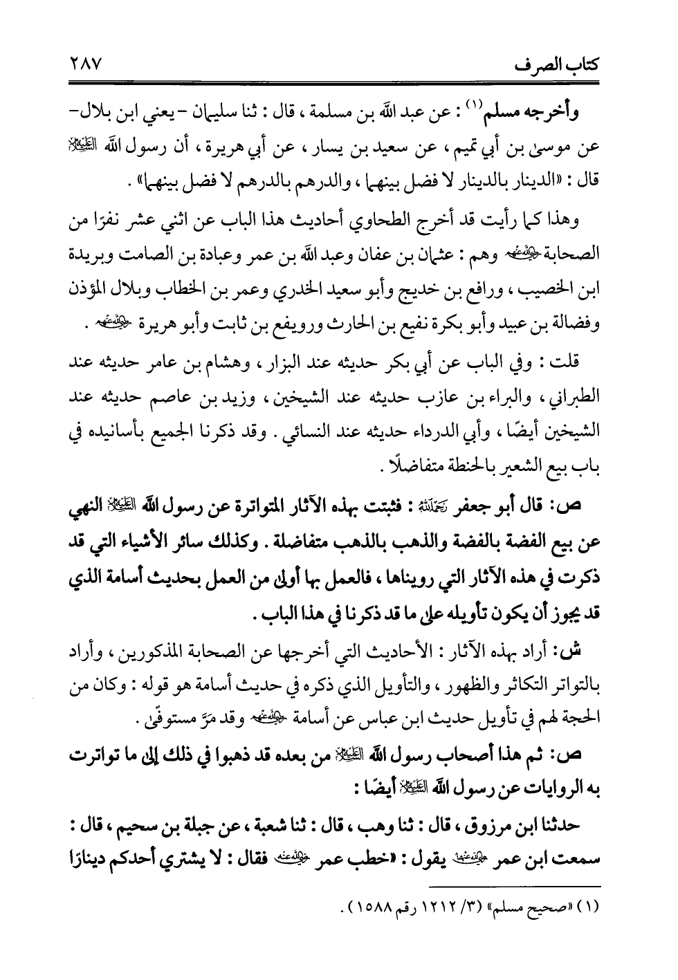 ص: قال أبو جعفر -رحمه الله-: فثبتت بهذه الآثار المتواترة عن رسول الله -عليه السلام- النهي عن بيع الفضة بالفضة والذهب بالذهب متفاضلة. وكذلك سائر الأشياء التي قد ذكرت في هذه الآثار التي رويناها، فالعمل بها أولى من العمل بحديث أسامة الذي قد يجوز أن يكون تأويله على ما قد ذكرنا في هذا الباب.