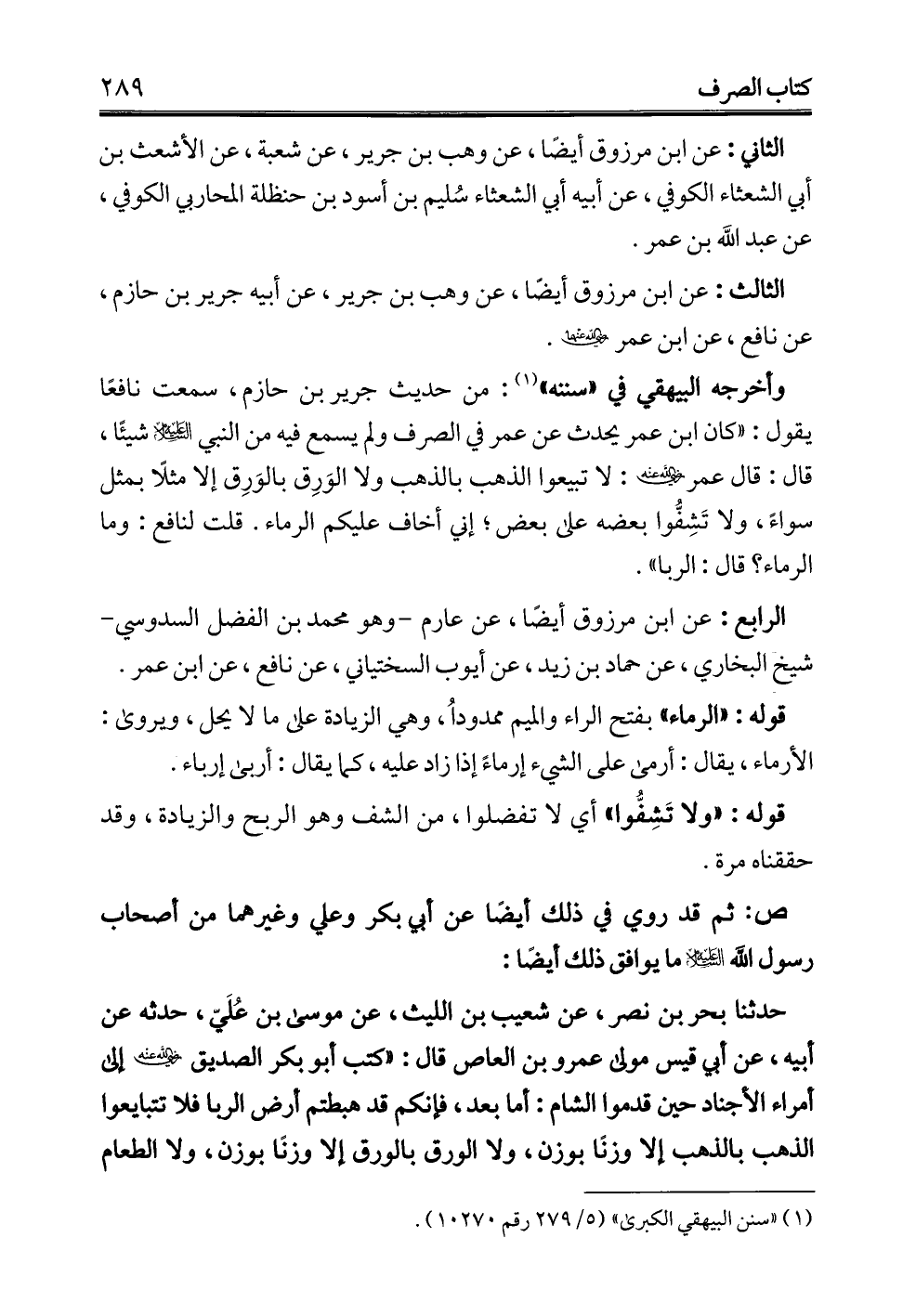 حدثنا بحر بن نصر، عن شعيب بن الليث، عن موسى بن عُلَيّ، حدثه عن أبيه، عن أبي قيس مولى عمرو بن العاص قال: "كتب أبو بكر الصديق - رضي الله عنه - إلى أمراء الأجناد حين قدموا الشام: أما بعد، فإنكم قد هبطتم أرض الربا فلا تتبايعوا الذهب بالذهب إلا وزنًا بوزن، ولا الورق بالورق إلا وزنًا بوزن، ولا الطعام