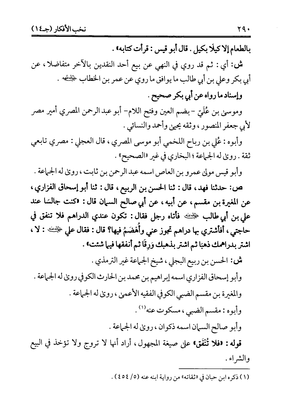 ص: حدثنا فهد، قال: ثنا الحسن بن الربيع، قال: ثنا أبو إسحاق الفزاري، عن المغيرة بن مقسم، عن أبيه، عن أبي صالح السمان قال: "كنت جالسًا عند علي بن أبي طالب - رضي الله عنه - فأتاه رجل فقال: تكون عندي الدراهم فلا تنفق في حاجتي، أفأشتري بها دراهم تجوز عني وأُهْضَمُ فيها؟ قال: فقال علي - رضي الله عنه -: لا، اشتر بدراهمك ذهبًا ثم اشتر بذهبك وَرِقًا ثم أنفقها فيما شئت".
