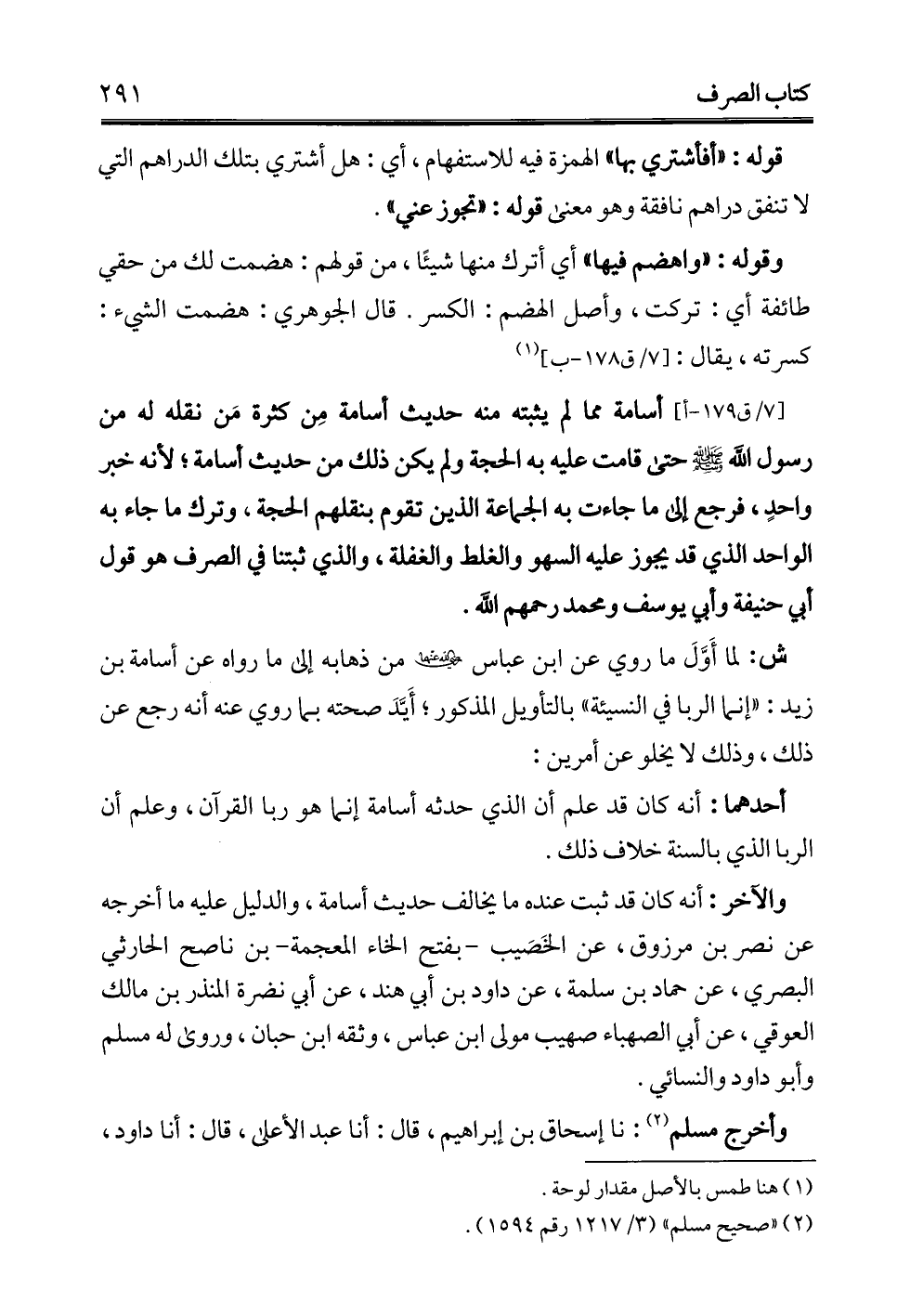 ... أسامة مما لم يثبته منه حديث أسامة مِن كثرة مَن نقله له من رسول الله - صلى الله عليه وسلم - حتى قامت عليه به الحجة ولم يكن ذلك من حديث أسامة؛ لأنه خبر واحدٍ، فرجع إلى ما جاءت به الجماعة الذين تقوم بنقلهم الحجة، وترك ما جاء به الواحد الذي قد يجوز عليه السهو والغلط والغفلة، والذي ثبتنا في الصرف هو قول أبي حنيفة وأبي يوسف ومحمد -رحمهم الله-.