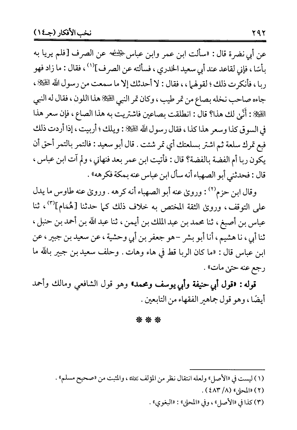 عن أبي نضرة قال: "سألت ابن عمر وابن عباس - رضي الله عنهم - عن الصرف [فلم يريا به بأسًا، فإني لقاعد عند أبي سعيد الخدري، فسألته عن الصرف] (¬1)، فقال: ما زاد فهو ربا، فأنكرت ذلك؛ لقولهما،، فقال: لا أحدثك إلا ما سمعت من رسول الله -عليه السلام-، جاءه صاحب نخله بصاع من تمر طيب، وكان تمر النبي -عليه السلام- هذا اللون، فقال له النبي -عليه السلام-: أَنَّى لك هذا؟ قال: انطلقت بصاعين فاشتريت به هذا الصاع، فإن سعر هذا في السوق كذا وسعر هذا كذا، فقال رسول الله -عليه السلام-: ويلك؛ أربيت، إذا أردت ذلك فبع تمرك سلعة ثم اشتر بسلعتك أي تمر شئت. قال أبو سعيد: فالتمر بالتمر أحق أن يكون ربا أم الفضة بالفضة؟ قال: فأتيت ابن عمر بعد فنهاني، ولم آت ابن عباس، قال: فحدثني أبو الصهباء أنه سأل ابن عباس عنه بمكة فكرهه".