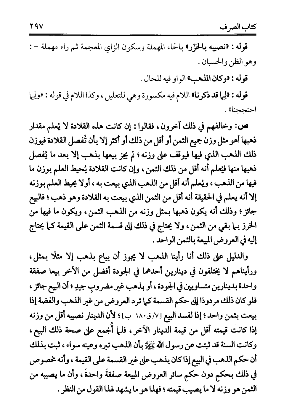ص: وخالفهم في ذلك آخرون، فقالوا: إن كانت هذه القلادة لا يُعلم مقدار ذهبها أهو مثل وزن جميع الثمن أو أقل من ذلك أو أكثر إلا بأن تُفصل القلادة فيوزن ذلك الذهب الذي فيها فيوقف على وزنه؛ لم يجز بيعها بذهب إلا بعد ما يُفصل ذهبها منها فيُعلم أنه أقل من ذلك الثمن، وإن كانت القلادة يُحيط العلم بوزن ما فيها من الذهب، ويُعلم أنه أقل من الذهب الذي بيعت به، أو لا يحيط العلم بوزنه إلا أنه يعلم في الحقيقة أنه أقل من الثمن الذي بيعت به القلادة وهو ذهب؛ فالبيع جائز؛ وذلك أنه يكون ذهبها بمثل وزنه من الذهب الثمن، ويكون ما فيها من الخرز بما بقي من الثمن، ولا يحتاج في ذلك إلى قسمة الثمن على القيمة كما يحتاج إليه في العروض المبيعة بالثمن الواحد.
