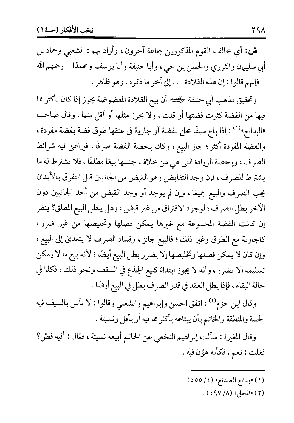 ش: أي خالف القوم المذكورين جماعة آخرون، وأراد بهم: الشعبي وحماد بن أبي سليمان والثوري والحسن بن حي، وأبا حنيفة وأبا يوسف ومحمدًا -رحمهم الله- فإنهم قالوا: إن هذه القلادة. . . . إلى آخر ما ذكره. وهو ظاهر.