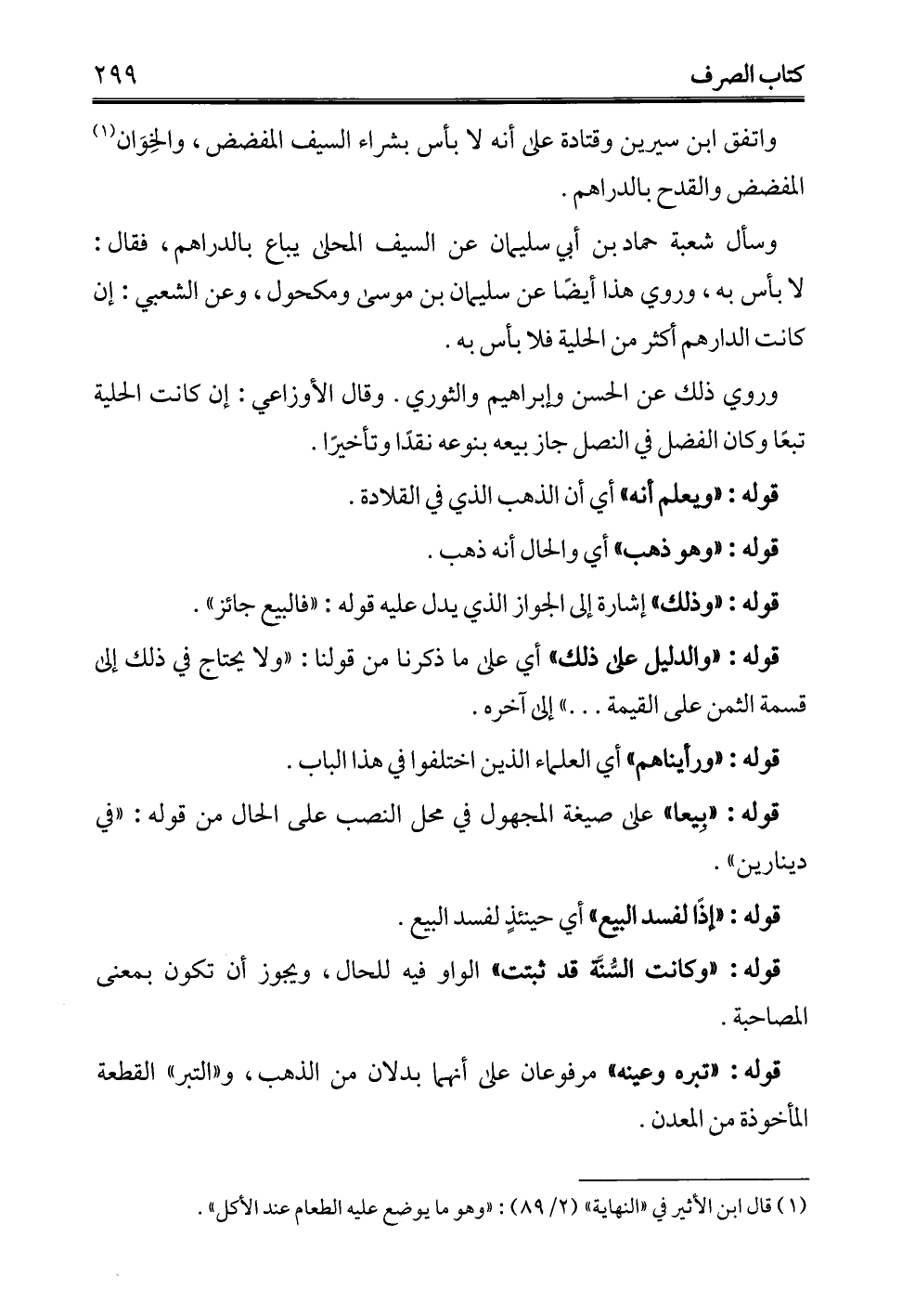 وسأل شعبة حماد بن أبي سليمان عن السيف المحلى يباع بالدراهم، فقال: لا بأس به، وروي هذا أيضًا عن سليمان بن موسى ومكحول، وعن الشعبي: إن كانت الدارهم أكثر من الحلية فلا بأس به.
