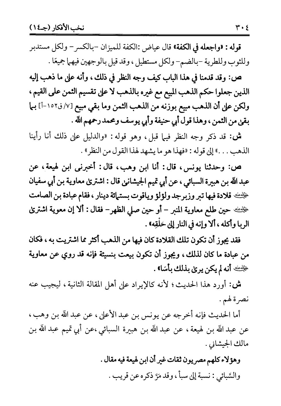 ص: وحدثنا يونس، قال: أنا ابن وهب، قال: أخبرنى ابن لهيعة، عن عبد الله بن هبيرة السبائي، عن أبي تميم الجيشاني قال: اشترى معاوية بن أبي سفيان - رضي الله عنه - قلادة فيها تبر وزبرجد ولؤلؤ وياقوت بستمائة دينار، فقام عبادة بن الصامت - رضي الله عنه - حين طلع معاوية المنبر -أو حين صلي الظهر- فقال: ألا إن معاوية اشترى الربا وأكله، ألا وإنه في النار إلى حَلْقِه".