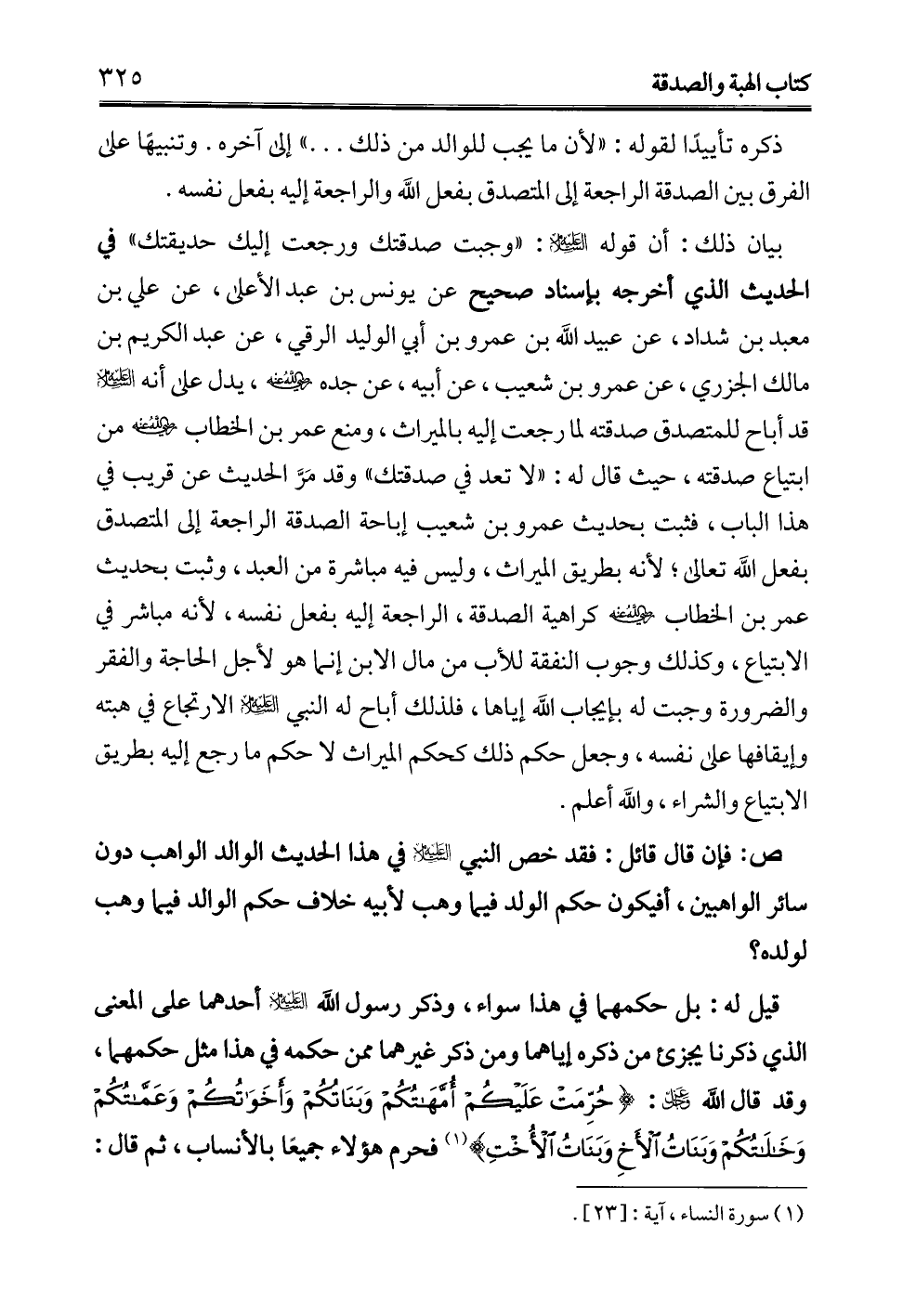بيان ذلك: أن قوله -عليه السلام-: "وجبت صدقتك ورجعت إليك حديقتك" في الحديث الذي أخرجه بإسناد صحيح عن يونس بن عبد الأعلى، عن علي بن معبد بن شداد، عن عبيد الله بن عمرو بن أبي الوليد الرقي، عن عبد الكريم بن مالك الجزري، عن عمرو بن شعيب، عن أبيه، عن جده - رضي الله عنه -، يدل على أنه -عليه السلام- قد أباح للمتصدق صدقته لما رجعت إليه بالميراث، ومنع عمر بن الخطاب - رضي الله عنه - من ابتياع صدقته، حيث قال له: "لا تعد في صدقتك" وقد مَرَّ الحديث عن قريب في هذا الباب، فثبت بحديث عمرو بن شعيب إباحة الصدقة الراجعة إلى المتصدق بفعل الله تعالى؛ لأنه بطريق الميراث، وليس فيه مباشرة من العبد، وثبت بحديث عمر بن الخطاب - رضي الله عنه - كراهية الصدقة، الراجعة إليه بفعل نفسه، لأنه مباشر في الابتياع، وكذلك وجوب النفقة للأب من مال الابن إنما هو لأجل الحاجة والفقر والضرورة وجبت له بإيجاب الله إياها، فلذلك أباح له النبي -عليه السلام- الارتجاع في هبته وإيقافها على نفسه، وجعل حكم ذلك كحكم الميراث لا حكم ما رجع إليه بطريق الابتياع والشراء، والله أعلم.