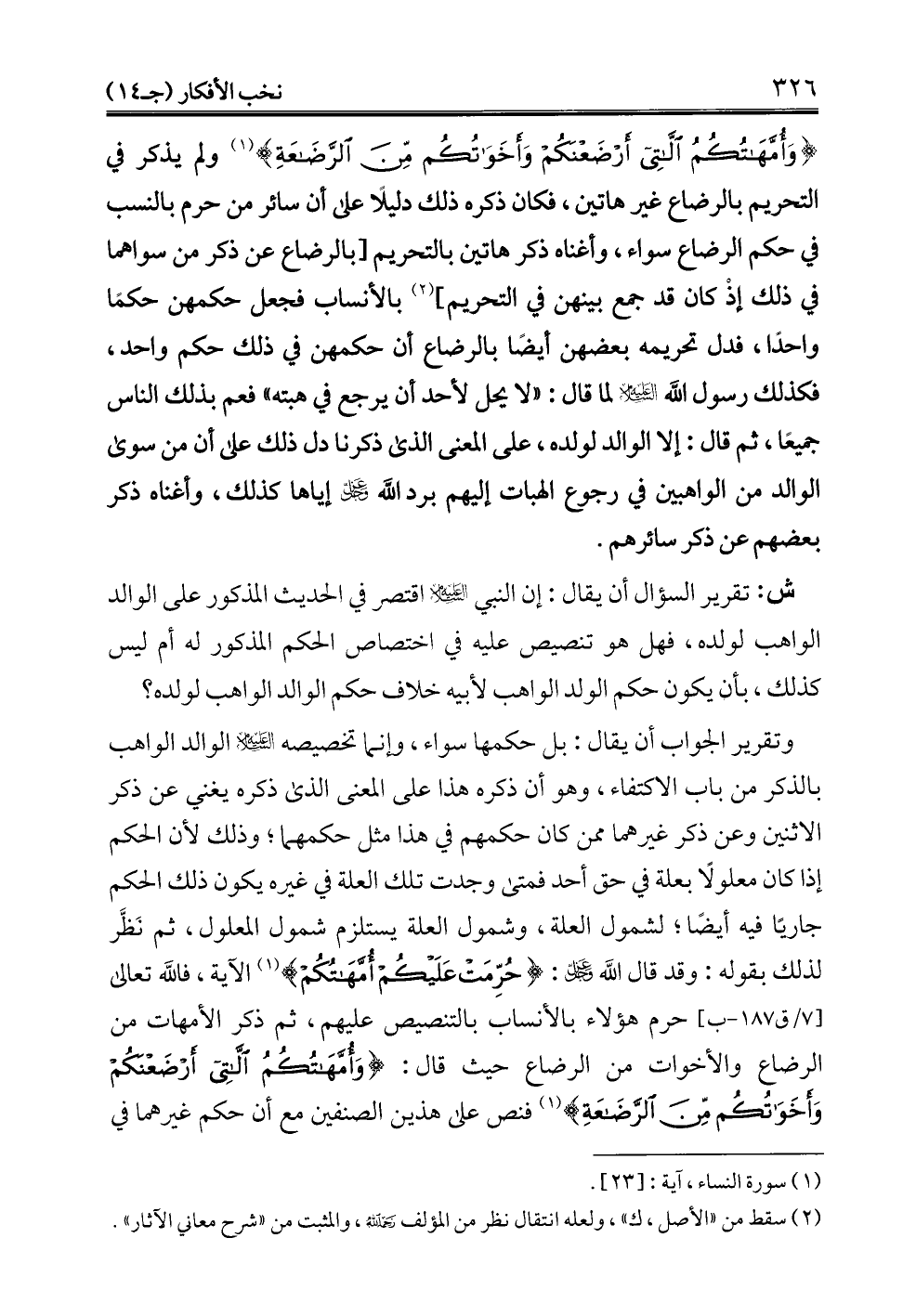 وتقرير الجواب أن يقال: بل حكمها سواء، وإنما تخصيصه -عليه السلام- الوالد الواهب بالذكر من باب الاكتفاء، وهو أن ذكره هذا على المعنى الذي ذكره يغني عن ذكر الاثنين وعن ذكر غيرهما ممن كان حكمهم في هذا مثل حكمهما؛ وذلك لأن الحكم إذا كان معلولًا بعلة في حق أحد فمتى وجدت تلك العلة في غيره يكون ذلك الحكم جاريًا فيه أيضًا؛ لشمول العلة، وشمول العلة يستلزم شمول المعلول، ثم نَظَّر لذلك بقوله: وقد قال الله -عز وجل-: {حُرِّمَتْ عَلَيْكُمْ أُمَّهَاتُكُمْ} (1) الآية، فالله تعالى حرم هؤلاء بالأنساب بالتنصيص عليهم، ثم ذكر الأمهات من الرضاع والأخوات من الرضاع حيث قال: {وَأُمَّهَاتُكُمُ اللَّاتِي أَرْضَعْنَكُمْ وَأَخَوَاتُكُمْ مِنَ الرَّضَاعَةِ} (1) فنص على هذين الصنفين مع أن حكم غيرهما في
