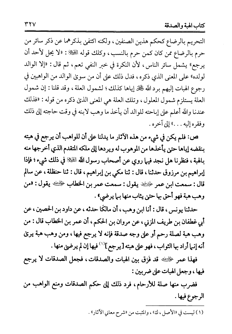 فهذا عمر - رضي الله عنه - قد فَرَّق بين الهبات والصدقات، فجعل الصدقات لا يرجع فيها، وجعل الهبات على ضربين: