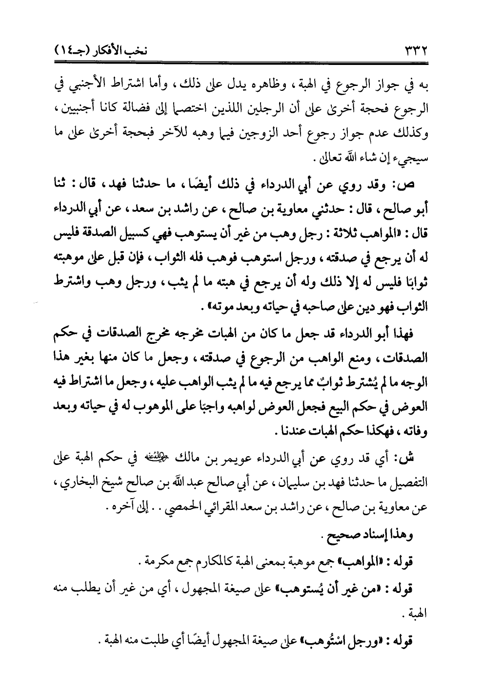 فهذا أبو الدرداء قد جعل ما كان من الهبات مخرجه مخرج الصدقات في حكم الصدقات، ومنع الواهب من الرجوع في صدقته، وجعل ما كان منها بغير هذا الوجه ما لم يُشترط ثوابٌ مما يرجع فيه ما لم يثب الواهب عليه، وجعل ما اشتراط فيه العوض في حكم البيع فجعل العوض لواهبه واجبًا على الموهوب له في حياته وبعد وفاته، فهكذا حكم الهبات عندنا.