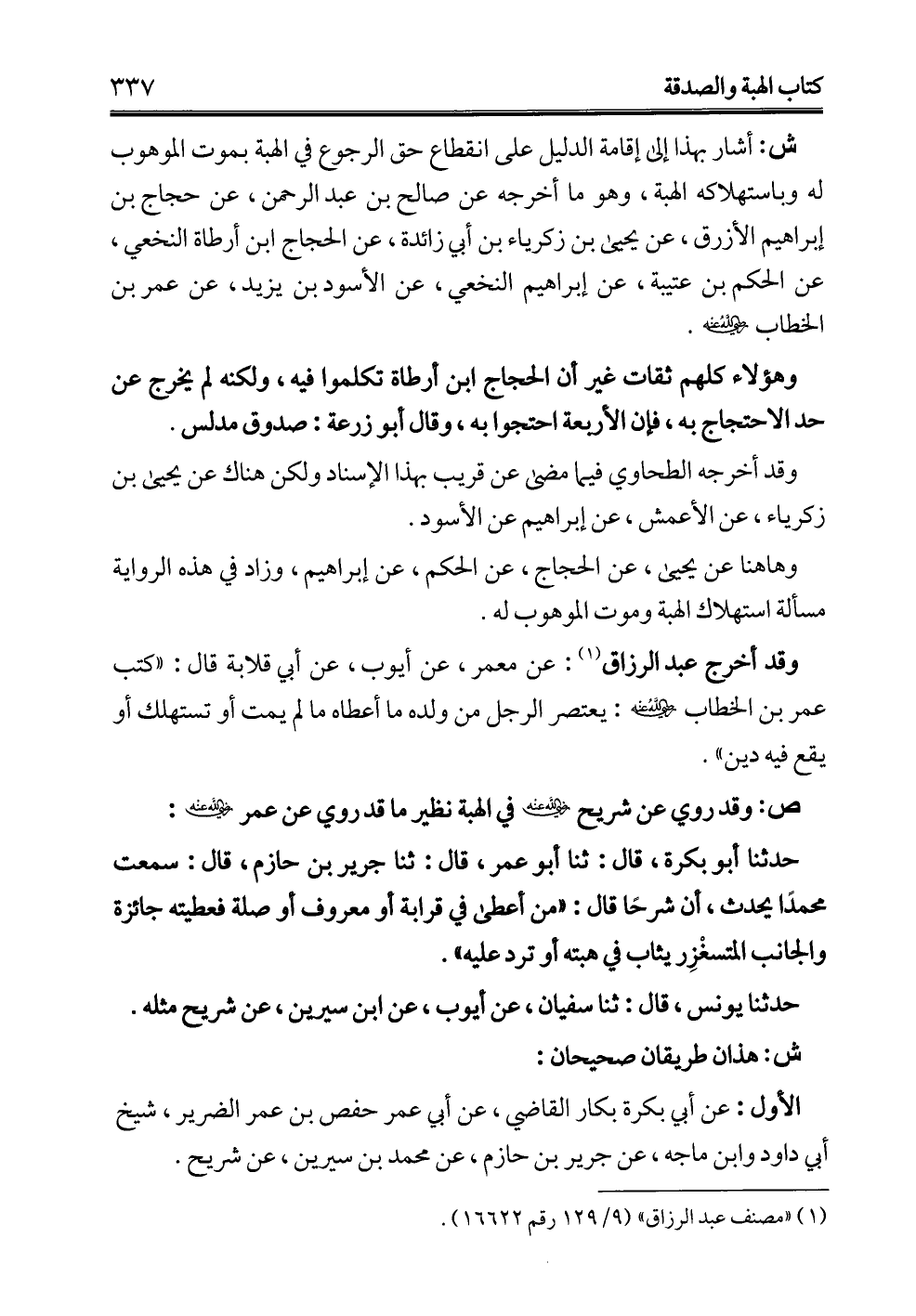 وهاهنا عن يحيى، عن الحجاج، عن الحكم، عن إبراهيم، وزاد في هذه الرواية مسألة استهلاك الهبة وموت الموهوب له.