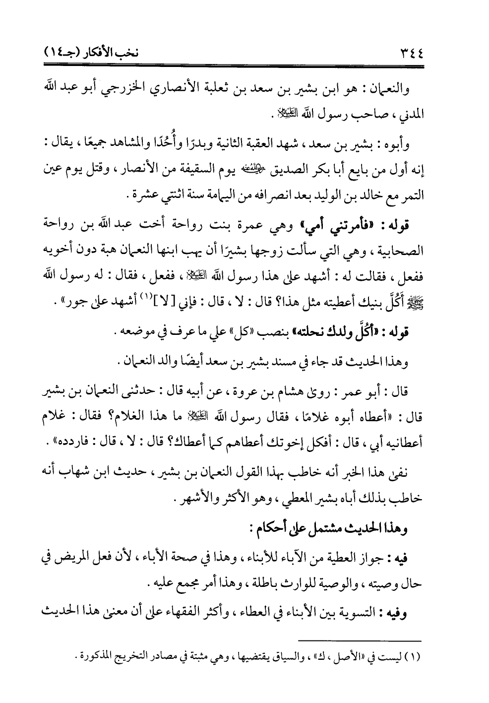 قال: أبو عمر: روى هشام بن عروة، عن أبيه قال: حدثني النعمان بن بشير قال: "أعطاه أبوه غلامًا، فقال رسول الله -عليه السلام- ما هذا الغلام؟ فقال: غلام أعطانيه أبي، قال: أفكل إخوتك أعطاهم كما أعطاك؟ قال: لا، قال: فاردده".