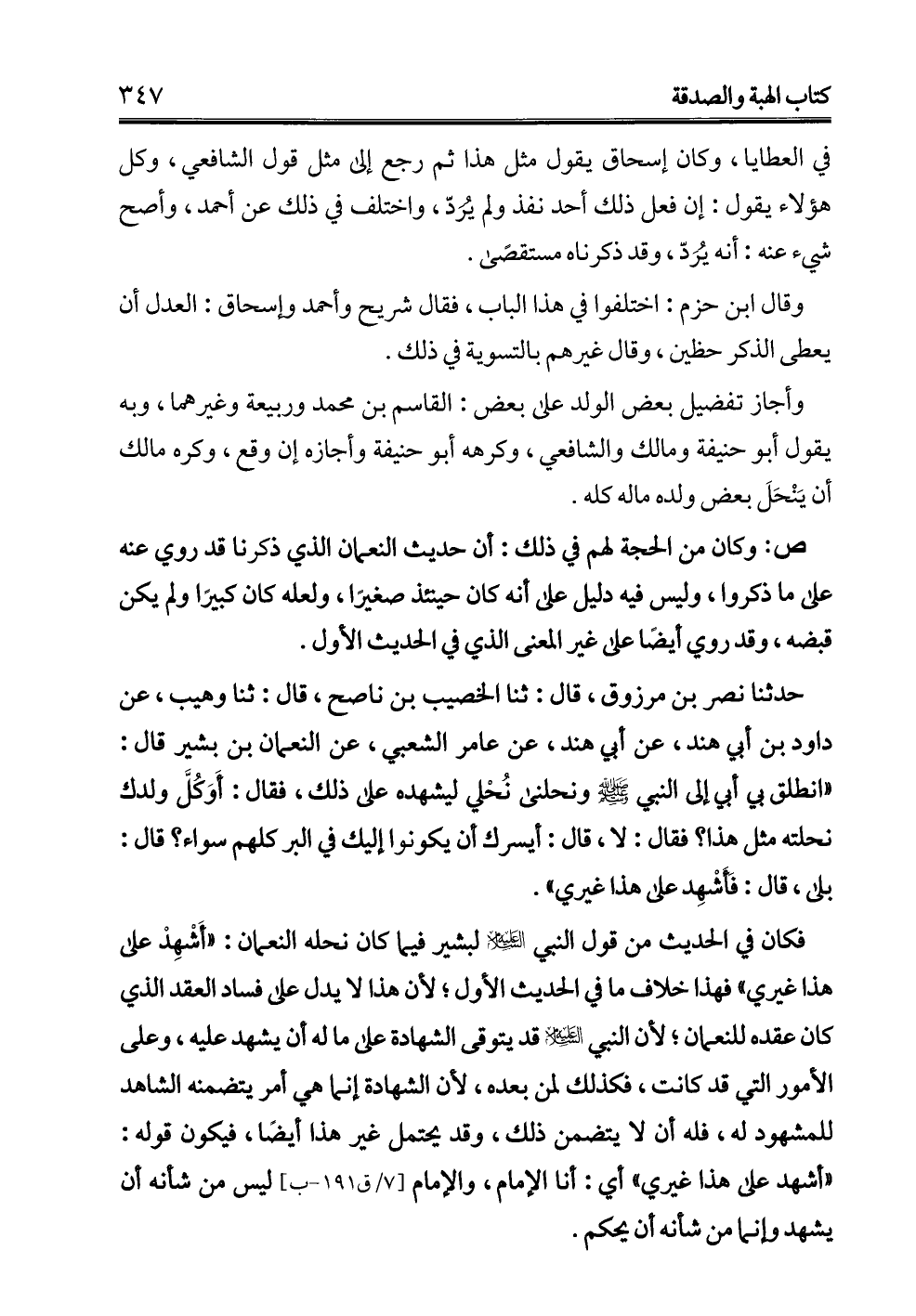 حدثنا نصر بن مرزوق، قال: ثنا الخصيب بن ناصح، قال: ثنا وهيب، عن داود بن أبي هند، عن أبي هند، عن عامر الشعبي، عن النعمان بن بشير قال: "انطلق بي أبي إلى النبي - صلى الله عليه وسلم - ونحلني نُحْلي ليشهده على ذلك، فقال: أَوَ كُلَّ ولدك نحلته مثل هذا؟ فقال: لا، قال: أيسرك أن يكونوا إليك في البر كلهم سواء؟ قال: بلى، قال: فأشْهِد على هذا غيري".