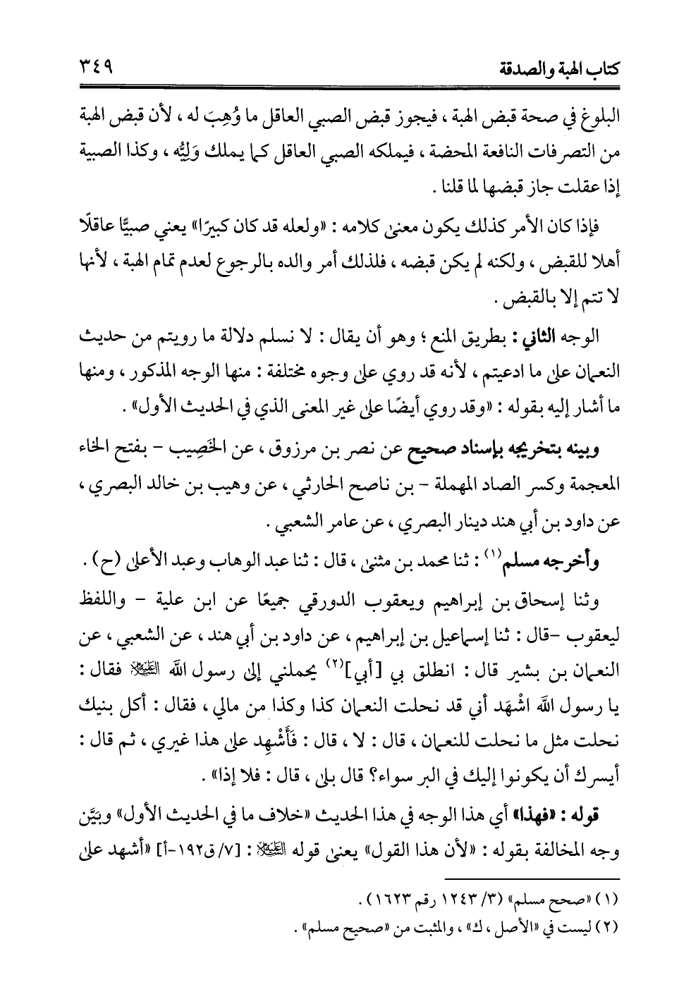 الوجه الثاني: بطريق المنع؛ وهو أن يقال: لا نسلم دلالة ما رويتم من حديث النعمان على ما ادعيتم، لأنه قد روي على وجوه مختلفة: منها الوجه المذكور، ومنها ما أشار إليه بقوله: "وقد روي أيضًا على غير المعنى الذي في الحديث الأول".