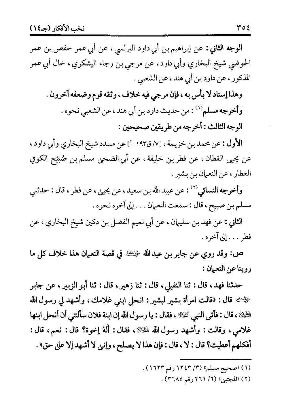 حدثنا فهد، قال: ثنا النفيلي، قال: ثنا زهير، قال: ثنا أبو الزبير، عن جابر - رضي الله عنه - قال: "قالت امرأة بشير لبشير: انحل ابني غلامك، وأشهد لي رسول الله -عليه السلام-، قال: فأتى النبي -عليه السلام-، فقال: يا رسول الله إن ابنة فلان سألتني أن أنحل ابنها غلامي، وقالت: وأشهد رسول الله -عليه السلام-، فقال: ألَهُ إخوة؟ قال: نعم، قال: أفكلهم أعطيت؟ قال: لا، قال: فإن هذا لا يصلح، وإني لا أشهد إلا على حق".