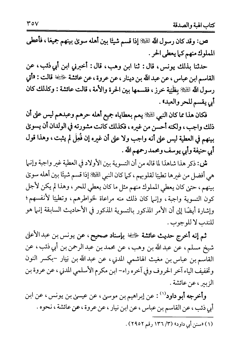 ش: ذكر هذا شاهدًا لما قاله من أن التسوية بين الأولاد في العطية غير واجبة وإنما هي أفضل من غيرها تطيبًا لقلوبهم، كما كان النبي -عليه السلام- إذا قسم شيئًا بين أهله سوى بينهم، حتى كان يعطي المملوك منهم مثل ما كان يعطي للحر، وهذا لم يكن لأجل كون التسوية واجبة، وإنما كان ذلك منه مراعاة لخواطرهم، وتطيبًا لأنفسهم؛ وإشارة أيضًا إلى أن الأمر المذكور بالتسوية المذكور في الأحاديث السابقة إنما هو للندب لا للوجوب.