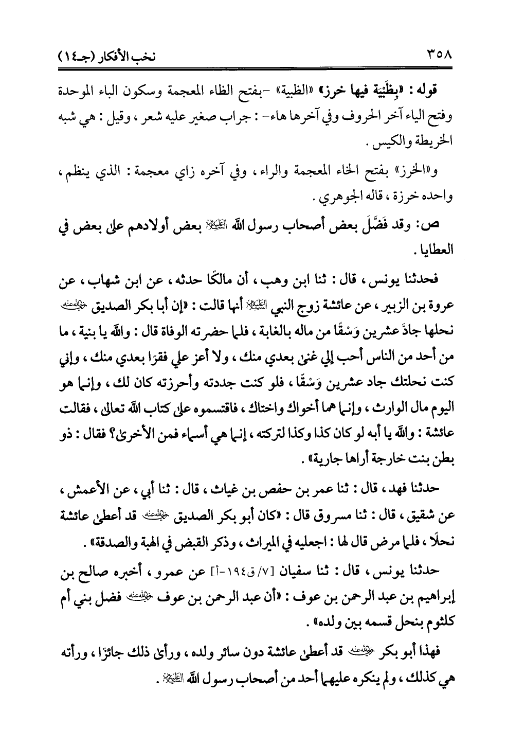 فحدثنا يونس، قال: ثنا ابن وهب، أن مالكًا حدثه، عن ابن شهاب، عن عروة بن الزبير، عن عائشة زوج النبي -عليه السلام- أنها قالت: "إن أبا بكر الصديق - رضي الله عنه - نحلها جادَّ عشرين وَسْقًا من ماله بالغابة، فلما حضرته الوفاة قال: والله يا بنية، ما من أحد من الناس أحب إلي غنى بعدي منك، ولا أعز علي فقرًا بعدي منك، وإني كنت نحلتك جاد عشرين وَسْقًا، فلو كنت جددته وأحرزته كان لك، وإنما هو اليوم مال الوارث، وإنما هما أخواك واختاك، فاقتسموه على كتاب الله تعالى، فقالت عائشة: والله يا أبه لو كان كذا وكذا لتركته، إنما هي أسماء فمن الأخرى؟ فقال: ذو بطن بنت خارجة أراها جارية".