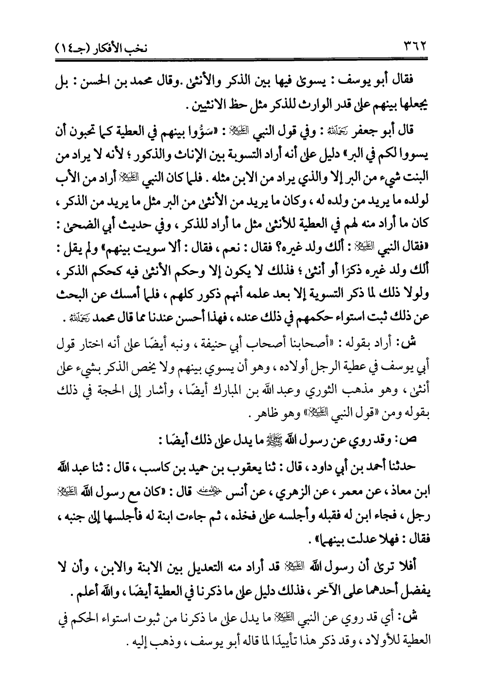ش: أراد بقوله: "أصحابنا أصحاب أبي حنيفة، ونبه أيضًا على أنه اختار قول أبي يوسف في عطية الرجل أولاده، وهو أن يسوي بينهم ولا يخص الذكر بشيء على أنثى، وهو مذهب الثوري وعبد الله بن المبارك أيضًا، وأشار إلى الحجة في ذلك بقوله ومن "قول النبي -عليه السلام-" وهو ظاهر.