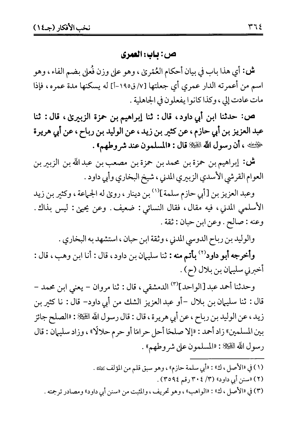 وحدثنا أحمد عبد [الواحد] (¬3) الدمشقي، قال: ثنا مروان -يعني ابن محمَّد- قال: ثنا سليمان بن بلال -أو عبد العزيز الشك من أبي داود- قال: نا كثير بن زيد، عن الوليد بن رباح، عن أبي هريرة، قال: قال رسول الله -عليه السلام-: "الصلح جائز بين المسلمين" زاد أحمد: "إلا صلحًا أحل حرامًا أو حرم حلالًا"، وزاد سليمان: قال رسول الله -عليه السلام-: "المسلمون على شروطهم".