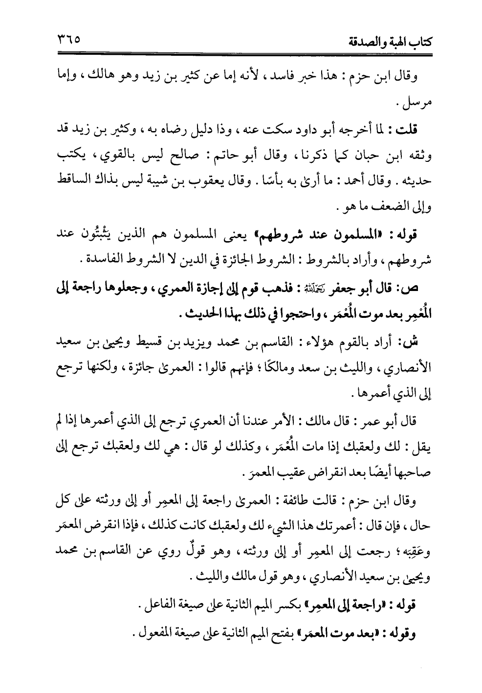 ش: أراد بالقوم هؤلاء: القاسم بن محمَّد ويزيد بن قسيط ويحيى بن سعيد الأنصاري، والليث بن سعد ومالكًا؛ فإنهم قالوا: العمرى جائزة، ولكنها ترجع إلى الذي أعمرها.