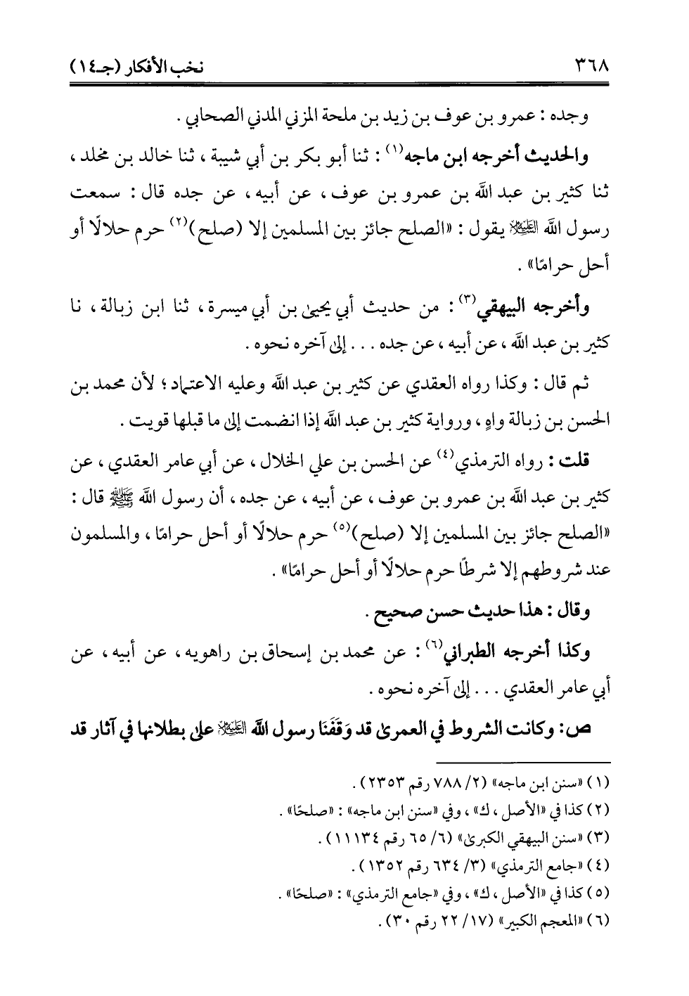 قلت: رواه الترمذي (¬4) عن الحسن بن علي الخلال، عن أبي عامر العقدي، عن كثير بن عبد الله بن عمرو بن عوف، عن أبيه، عن جده، أن رسول الله - صلى الله عليه وسلم - قال: "الصلح جائز بين المسلمين إلا (صلح) (¬5) حرم حلالًا أو أحل حرامًا، والمسلمون عند شروطهم إلا شرطًا حرم حلالًا أو أحل حرامًا".