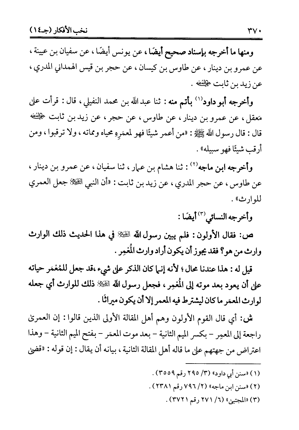 وأخرجه ابن ماجه (¬2): ثنا هشام بن عمار، ثنا سفيان، عن عمرو بن دينار، عن طاوس، عن حجر المدري، عن زيد بن ثابت: "أن النبي -عليه السلام- جعل العمري للوارث".