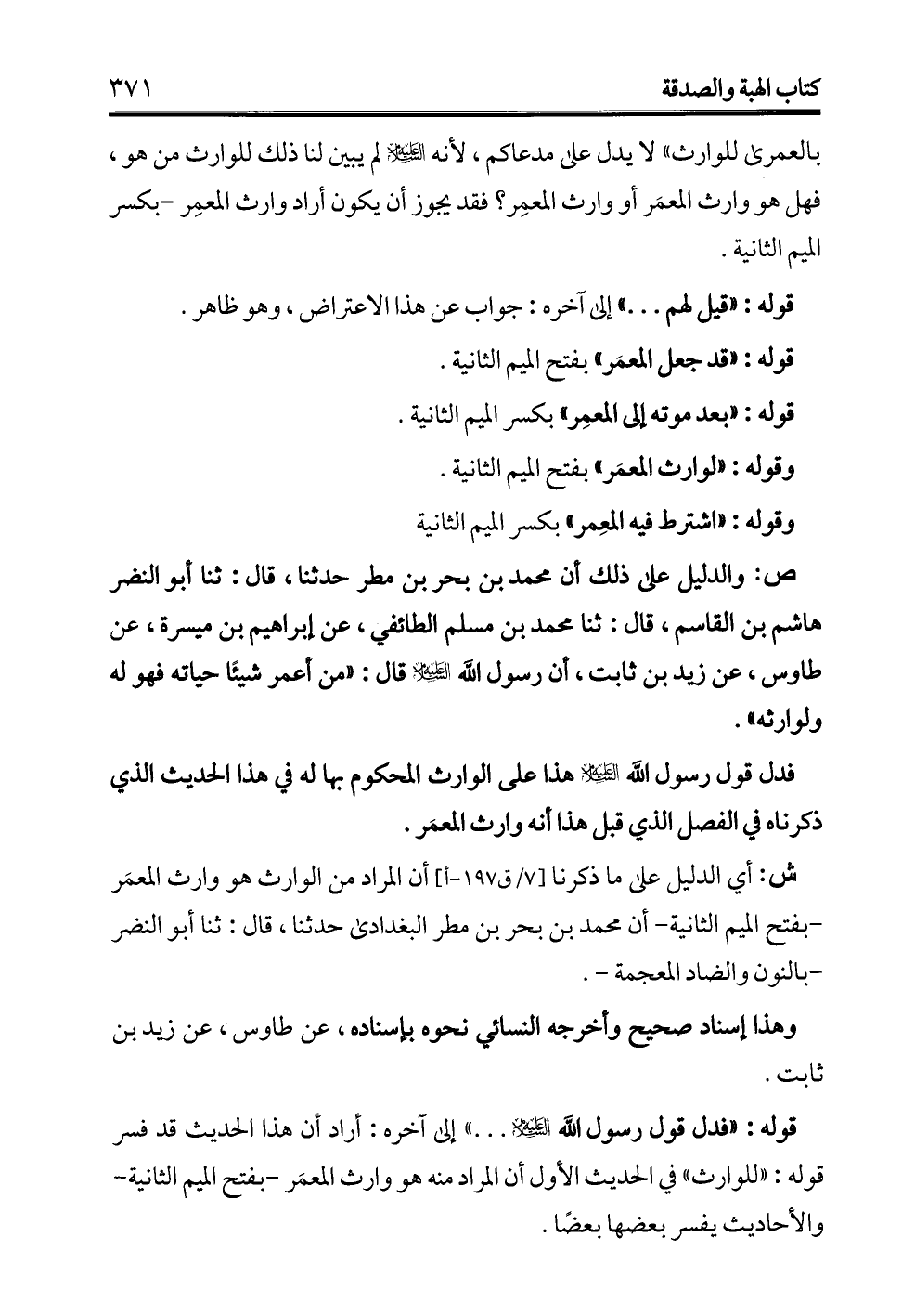 ص: والدليل على ذلك أن محمَّد بن بحر بن مطر حدثنا، قال: ثنا أبو النضر هاشم بن القاسم، قال: ثنا محمَّد بن مسلم الطائفي، عن إبراهيم بن ميسرة، عن طاوس، عن زيد بن ثابت، أن رسول الله -عليه السلام- قال: "من أعمر شيئًا حياته فهو له ولوارثه".