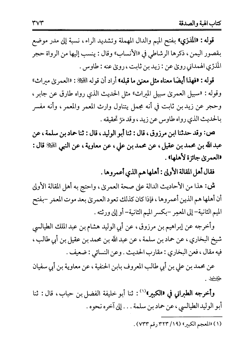 ش: هذا من الأحاديث الدالة على صحة العمرى، واحتج به أهل المقالة الأولى أن أهلها هم الذين أعمروها، فإذا كان كذلك تعود العمرى بعد موت المعمَر -بفتح الميم الثانية- إلى المعمِر -بكسر الميم الثانية- أو إلى ورثته.