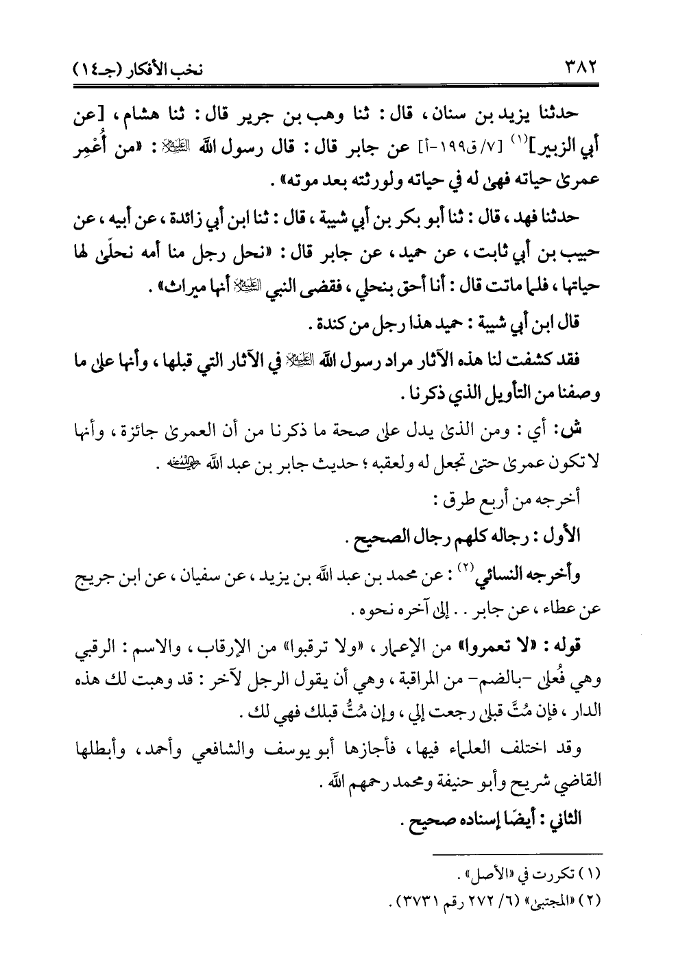 حدثنا فهد، قال: ثنا أبو بكر بن أبي شيبة، قال: ثنا ابن أبي زائدة، عن أبيه، عن حبيب بن أبي ثابت، عن حميد، عن جابر قال: "نحل رجل منا أمه نحلى لها حياتها، فلما ماتت قال: أنا أحق بنحلي، فقضى النبي -عليه السلام- أنها ميراث".
